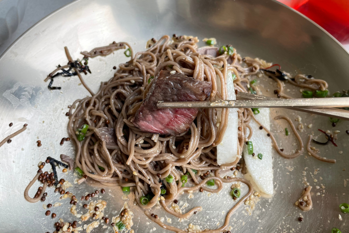 Товч махтай хамт ирсэн хачирууд болон васаби нь үүнийг илүү амттай болгож байв. Donghwa Goldongmyeon, энэ нь хүйтэн гурвалжин будааны гоймонгийн хоол бөгөөд кунжутын тосноос гүн амттай байсан бөгөөд махтай хамт идэхэд бас маш сайн байв.
