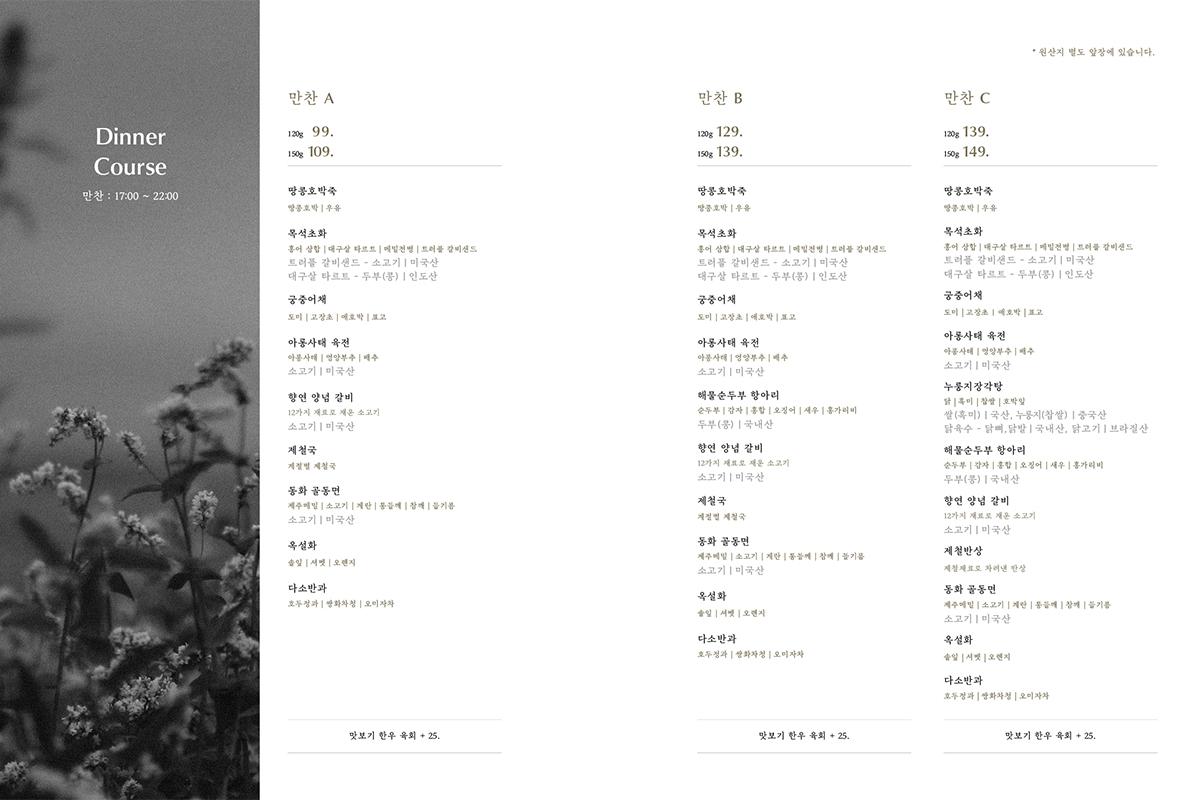 Газрын самар, Хулууны Будаа, Моксеокчохва, Хааны Загасны Салат, Үхрийн Махан Халуун Хоол, Далайн Хүнсний Зөөлөн Тофу Шөл, Даршилсан Банкет Хавирга, Улирлын Шөл, Донхва Голдонгмён, Окселхва, Дасобанва