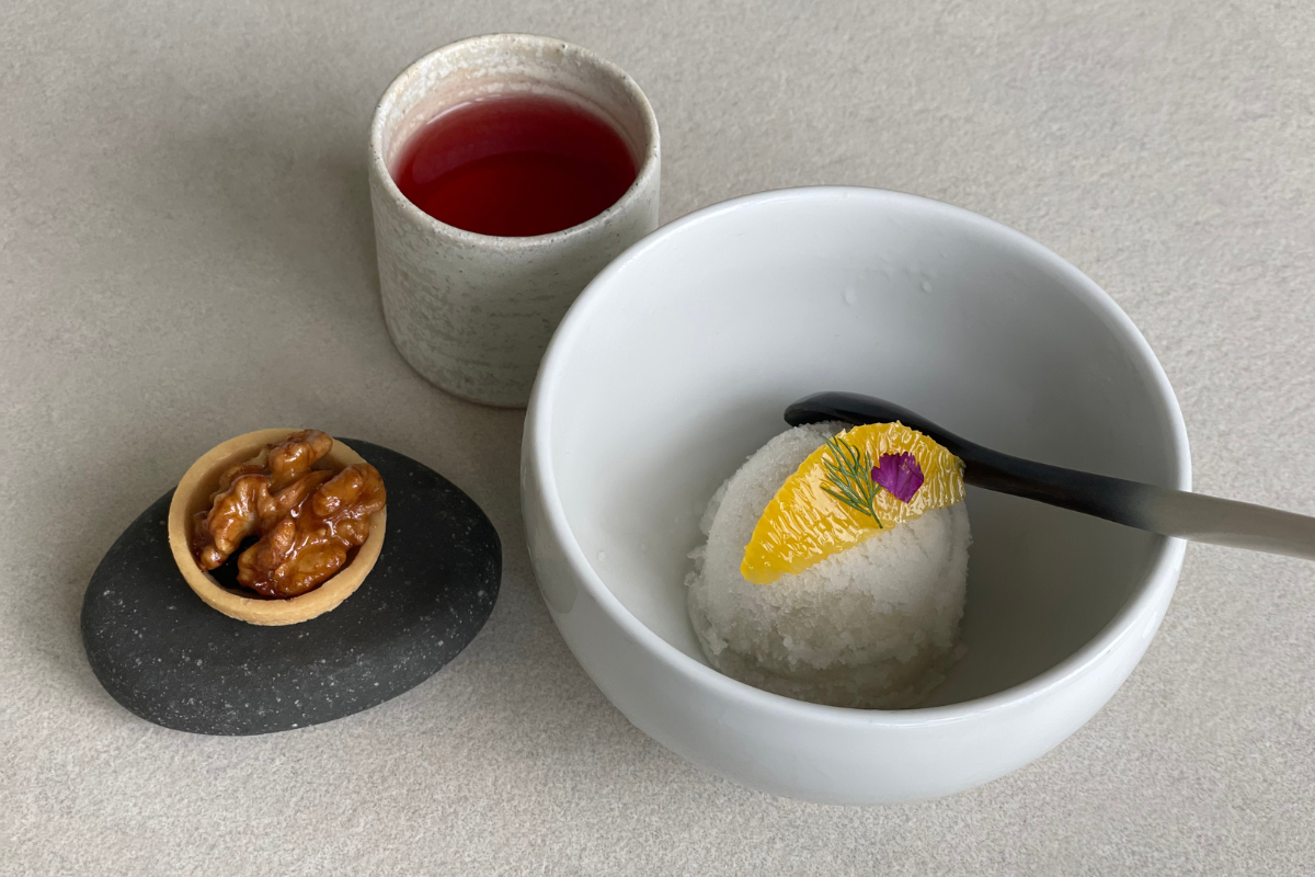 Эцэст нь бид Okseolhwa сорбетыг амсч хоолоо дуусгасан бөгөөд энэ нь өвөрмөц, сэргээсэн амттай байлаа.