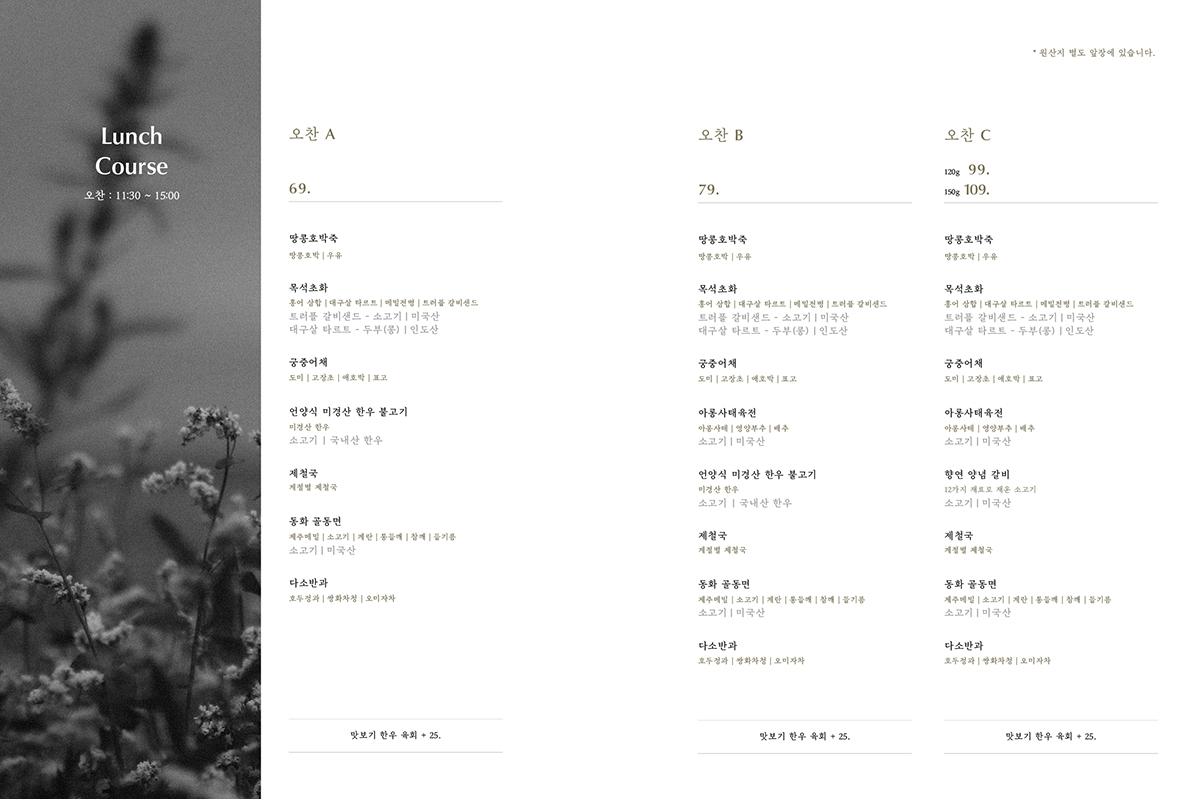 Газрын самар, Хулууны Будаа, Моксеокчохва, Хааны Загасны Салат, Үхрийн Махан Халуун Хоол, Шаржигнууртай Будааны Шөл, Далайн Хүнсний Зөөлөн Тофу Шөл, Даршилсан Банкет Хавирга, Улирлын Хоол, Донхва Голдонгмён, Окселхва, Дасобанва