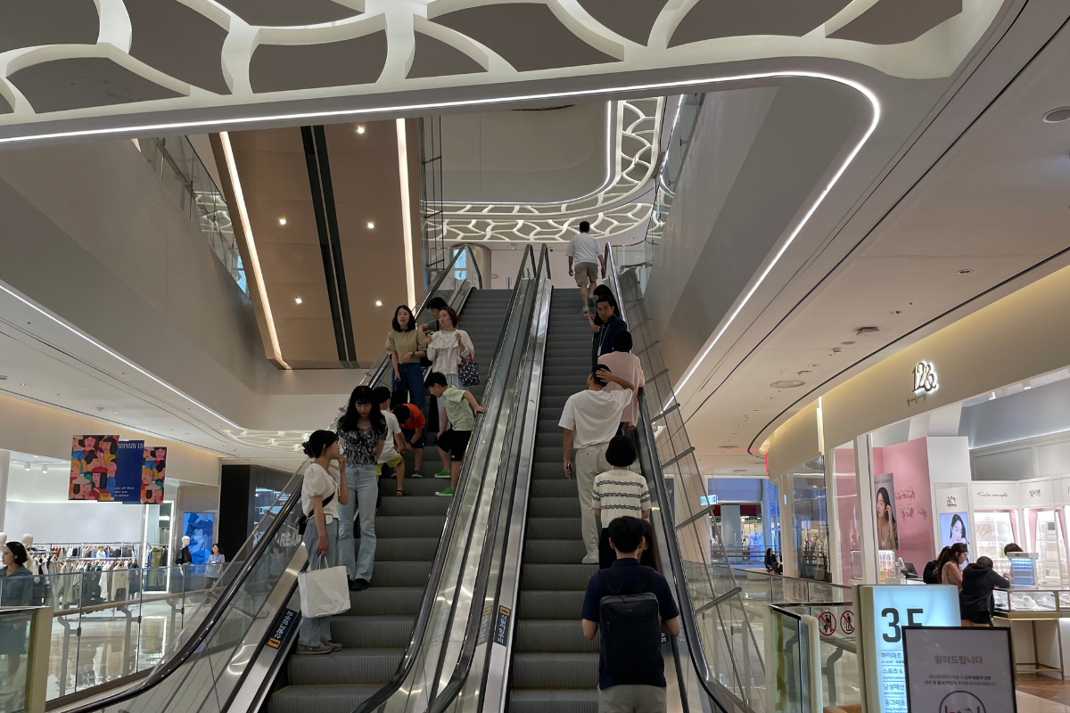 Lotte World Mall-ийн орц харагдахад, эдгээр хаалгаар дотогш ороорой.