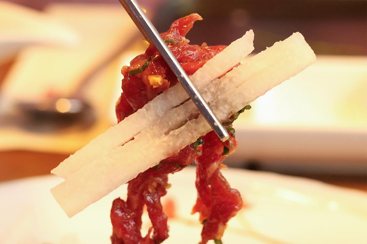Би махыг шараад, канджи (юхве) идсэн. Өдөр тутам хэрэглэдэг хоолын хувьд махны чанар чухал бөгөөд, Бо Реум Сэ нь хамгийн өндөр чанартай Жэжү хар махыг ашигладаг, энэ нь шинэ бөгөөд сайхан бүтэцтэй. Нохой (жамц) жимстэй хамт идэхэд, энэ нь чихэрлэг амт болон хрустящ бүтэцтэйгээс илүү амттай болдог.
