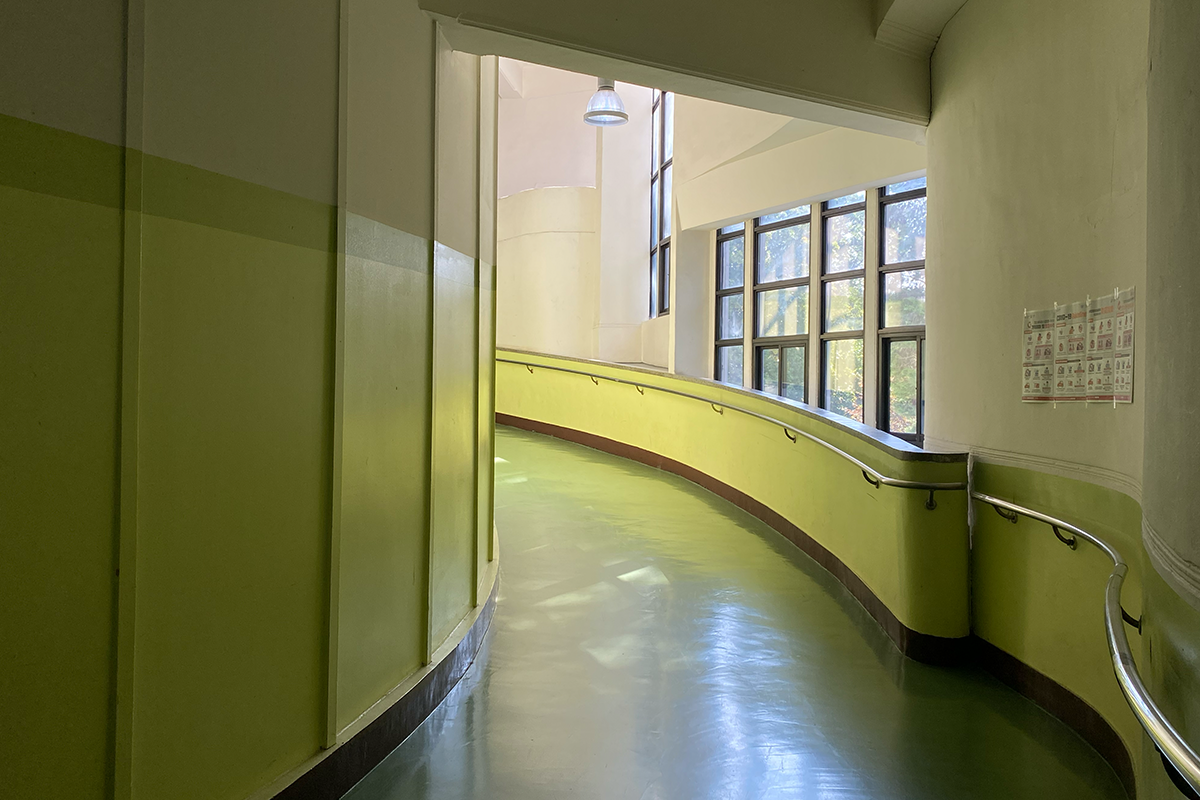 Энэ барилгын интерьер нь онцгой харагдаж байна, учир нь эхэндээ бид ямар ч шат хараагүй. Дээш гарахын тулд, бид энэ тахир замаар дээш гарсан.
