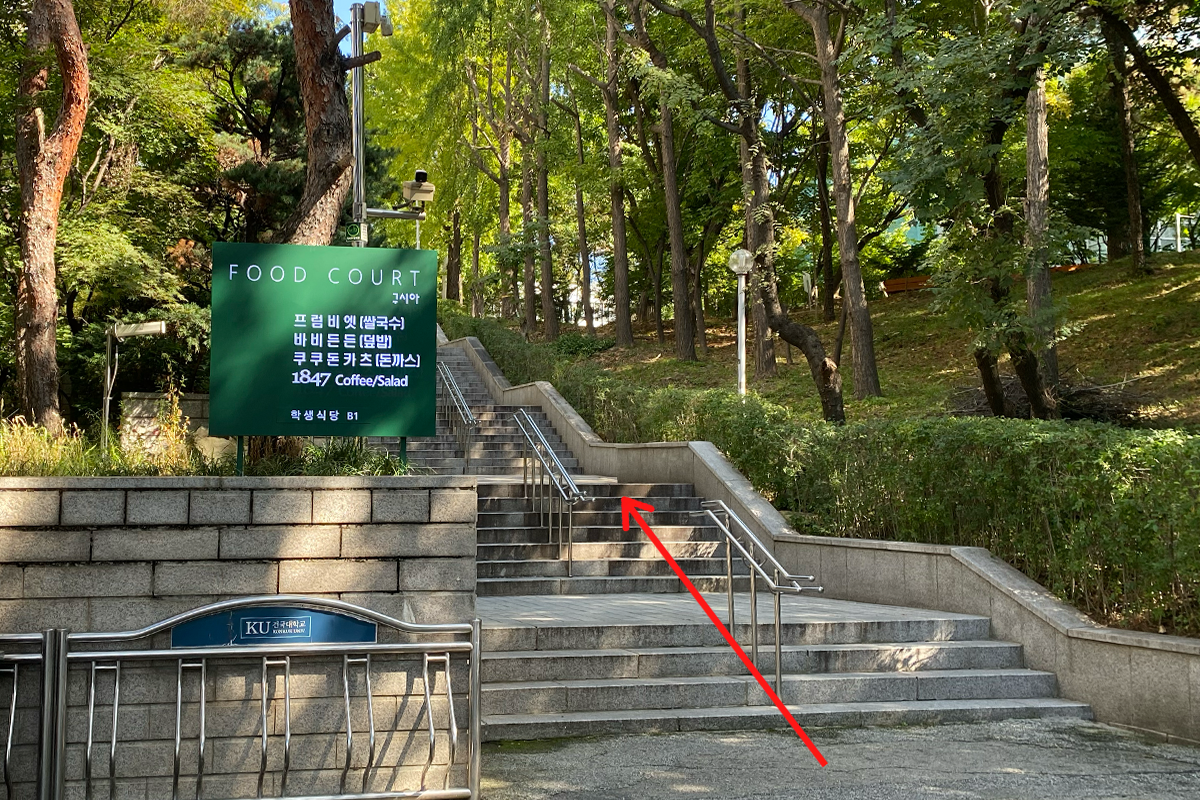 Konkuk-ын их сургуулийн метроны буудлын 2-р гарцаас гараад 4 минут яв. Тэгээд Konkuk их сургуулийн гол хаалгыг харах болно.