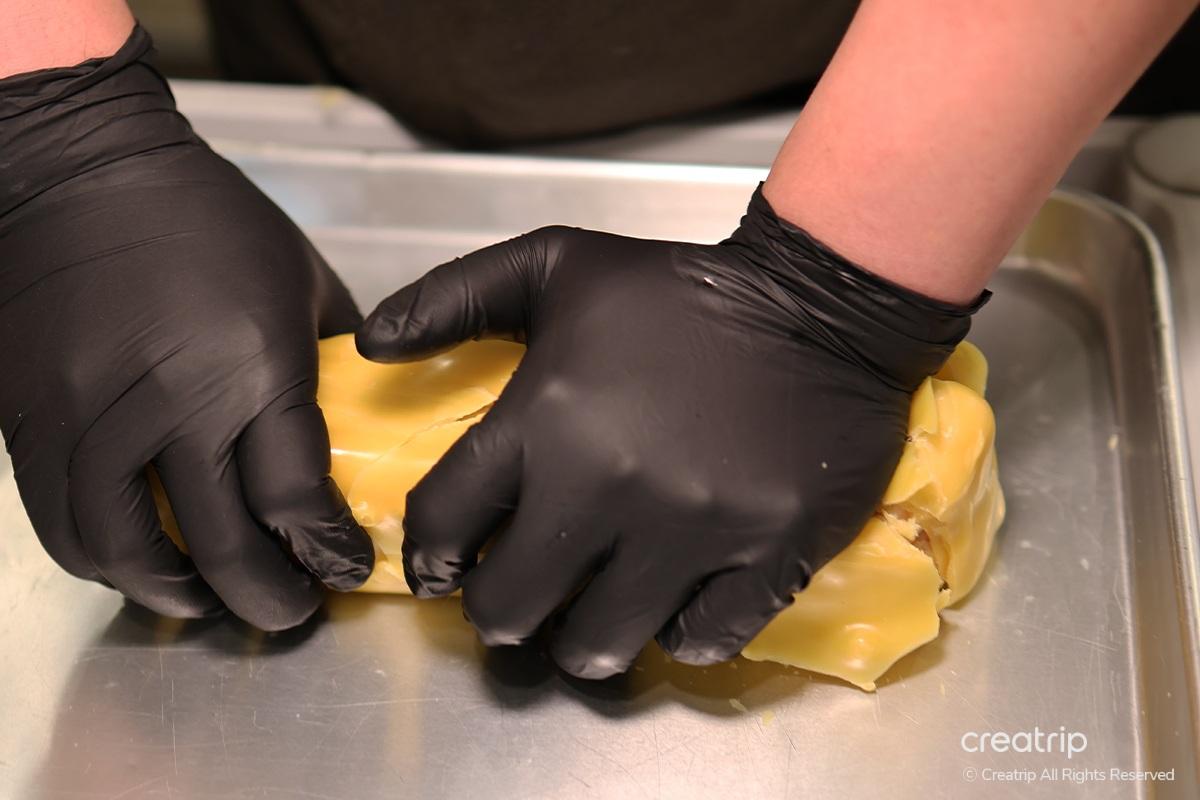 Ажилчид настай гахайн гэдсийг авчирч, таны өмнө бэлтгэж эхэлдэг. Зузаан хатуу лавын давхаргууд аажимдаа хууларч, амттай настай гахайн гэдсийг ил гаргадаг.
