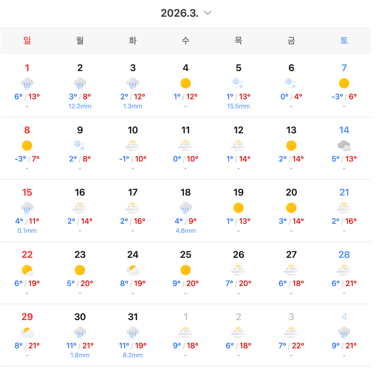 Korea нь 3-р сарын сүүлчээр дулаарч эхэлдэг, энэ үед урт Winter хугацаа дуусч цэцэгс дэлгэрдэг. 3-р сар ихэвчлэн үүлэрхэг өдөр болон температурын огцом хэлбэлзэл дагуулдаг. 4-р сар ба 5-р сарт дулаан байдал тогтмол нэмэгдэж, дунджаар 22°C хүрдэг, Korea-ийн Spring гоо үзэсгэлэнг мэдрэхэд хамгийн тохиромжтой байдаг. 4-р сарын сакура болон 5-р сарын хааны азалей энэ улирлын онцлох зүйлс юм.