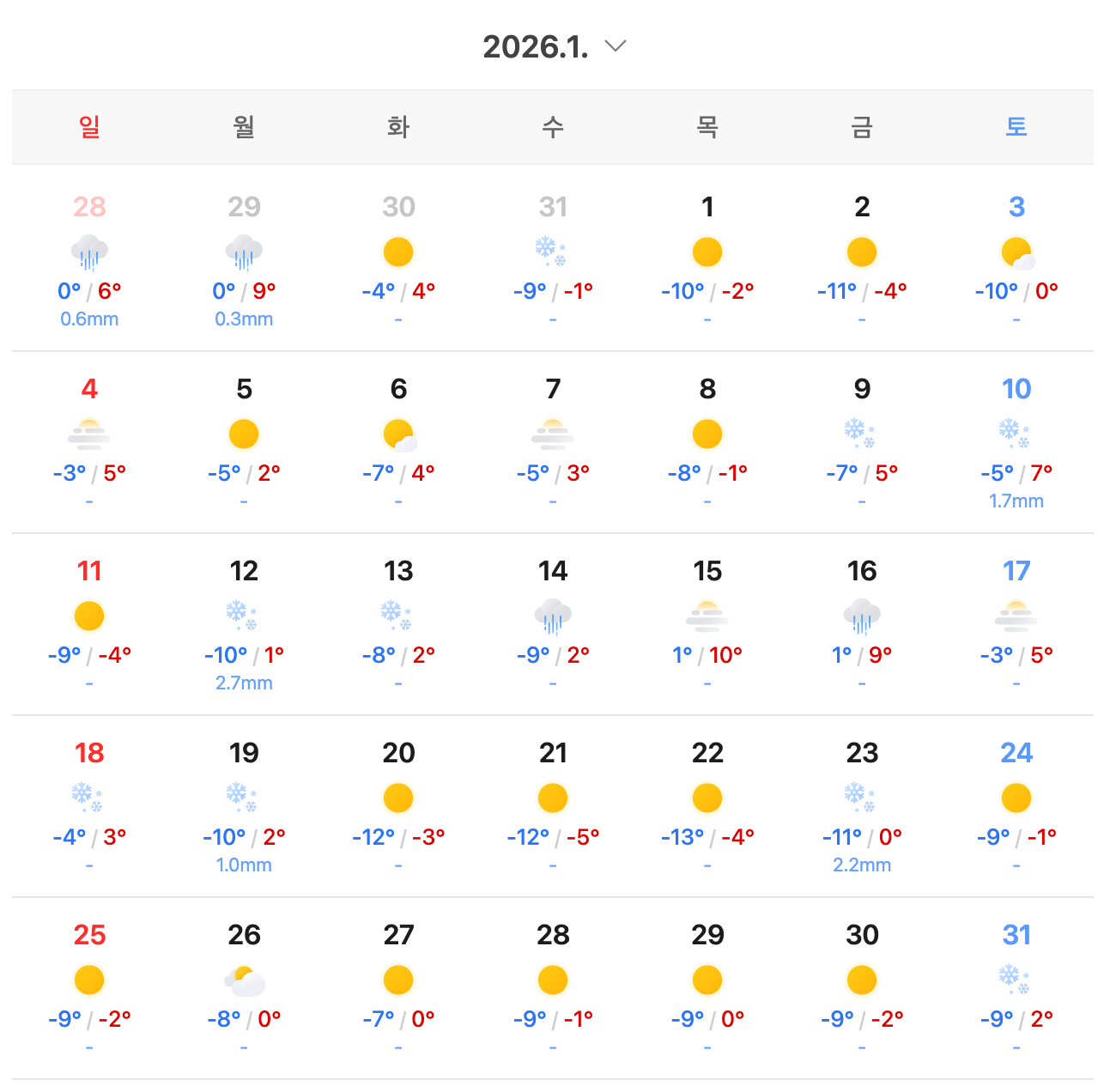 1 болон 2 сар нь цас хамгийн их ордог сарууд бөгөөд Daegu эсвэл Busan зэрэг өмнөд хотуудад цас багатай байх боломжтой. Korea-д өвөл нь Хойд Америкийнхаас илүү чийгтэй тул температур харьцангуй зөөлөн байсан ч биеийг хөргөж мэднэ. Өвлийн аялалд зузаан пүүфер куртка, бээлий, ороолт хэрэглэхийг ихээр зөвлөж байна.