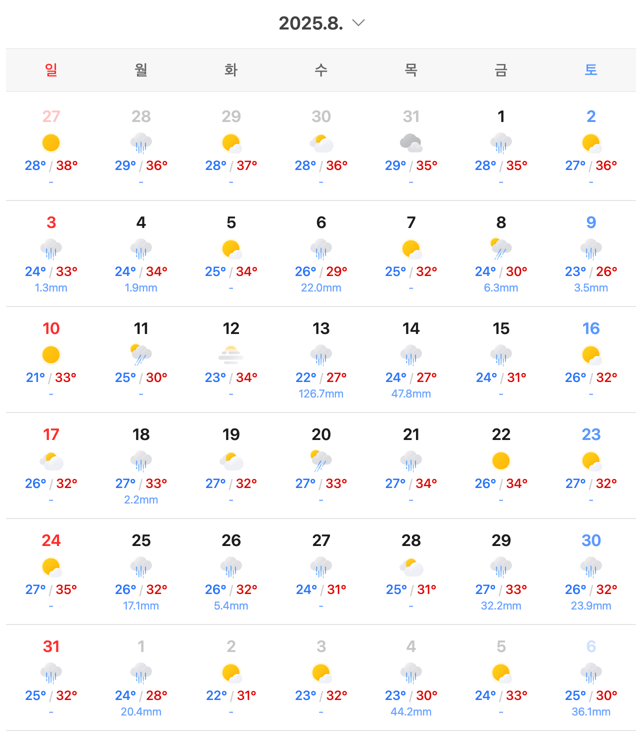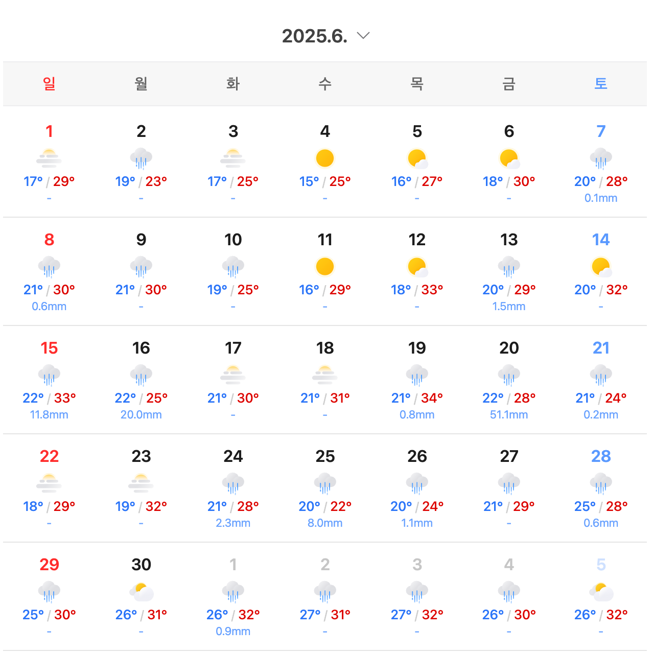 6 дугаар сард South Korea-н цаг агаар нь одоогоор харьцангуй сэрүүн байдаг, та нимгэн пальто болон урт өмд өмссөн хэвээр байж болно, тэр дундаа Busan-д ч адил. Гэвч rainy season дууссаны дараа чийгшил ба халуун нь гадуурх хувцас хэрэглэхэд тохиромжгүй болгодог. Тодорхой өөрчлөлт ажиглагддаг, зун дунд үеэс өмнөх үед температур ойролцоогоор 33°C хүрч, чийгшил багатай байдаг, харин rainy season-ын дараа температур болон чийгшил аль аль нь ихээр нэмэгддэг. Korea-д хамгийн халуун сарууд нь 7 дугаар сарын сүүлч ба 8 дугаар сар юм. Температур нь дэндүү халуун, чийглэг байж болох тул түүнийхээ дагуу бэлтгэлтэй байх хэрэгтэй.