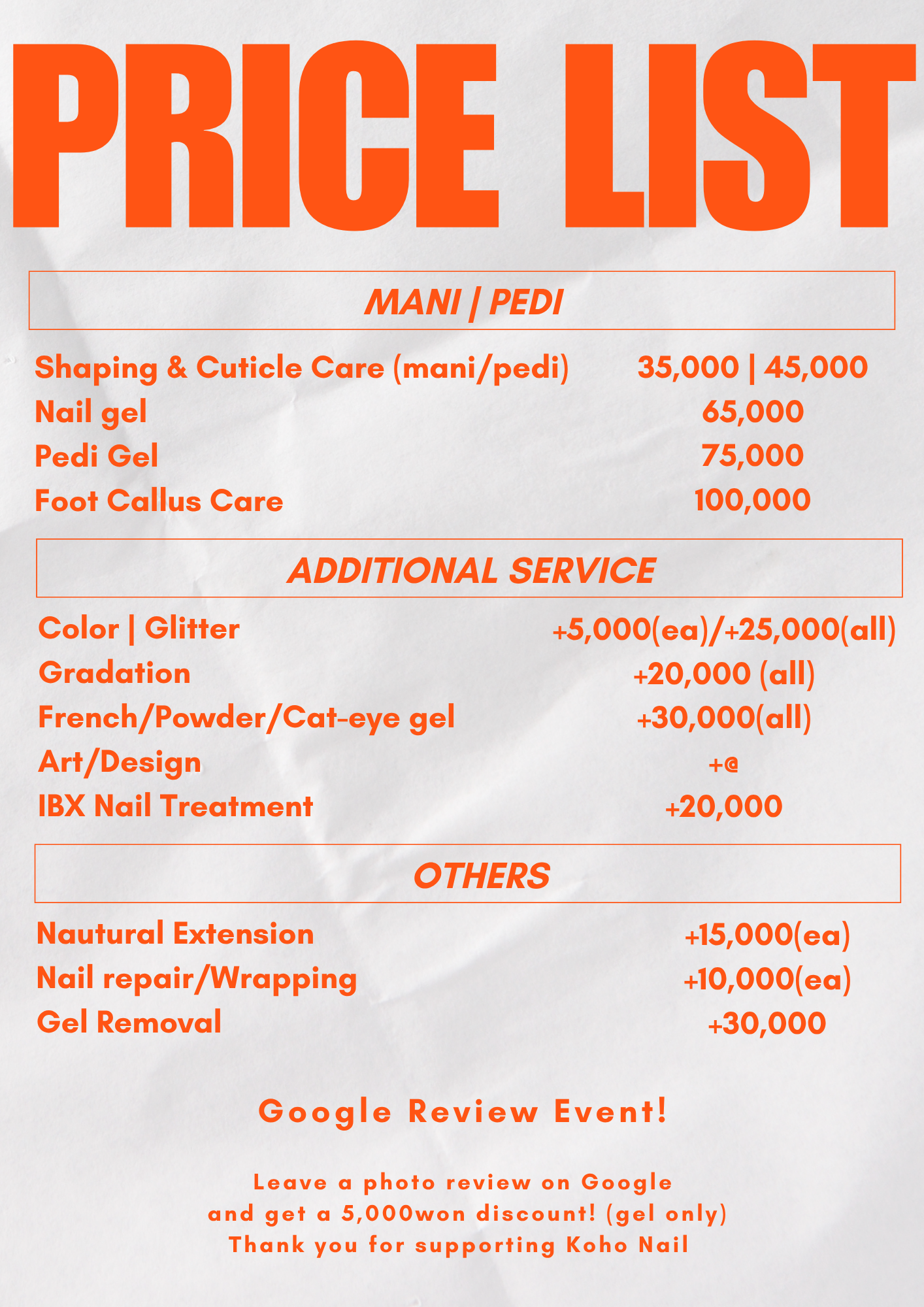 Яагаад бид үүнийг санал болгодог вэ COEX-ээс ердөө 3 минутын алхамын зайтай, ирэхэд хялбар.Англи хэлээр харилцах боломжтой ажиллагсадтай тул тухтай, саадгүй үйлчилгээ.Цэвэрхэн, орчин үеийн талбай, найдвартай ариун цэврийн нөхцөл.Анхааралтай, загвартай трэндсэн Korean nail дизайнууд.Найз, гэр бүлийнхэн хамтдаа эмчилгээ үйлчилгээ аван баяртай өнгөрөөж болно.Хумсны гель[Зураг слайдер] Педи Гел[Зураг слайдер] Хумсны урлаг[Зураг слайдэр] Педи Арт[Зураг слайдер] Сулбай (10 хуруу)[Зураг солих]