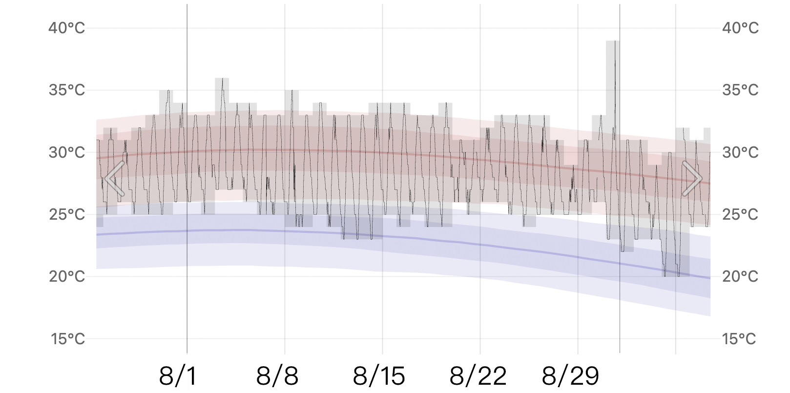 Graph illustrating Seoul's temperature range in August 2023, showcasing fluctuating highs and lows, provided by Weatherspark.