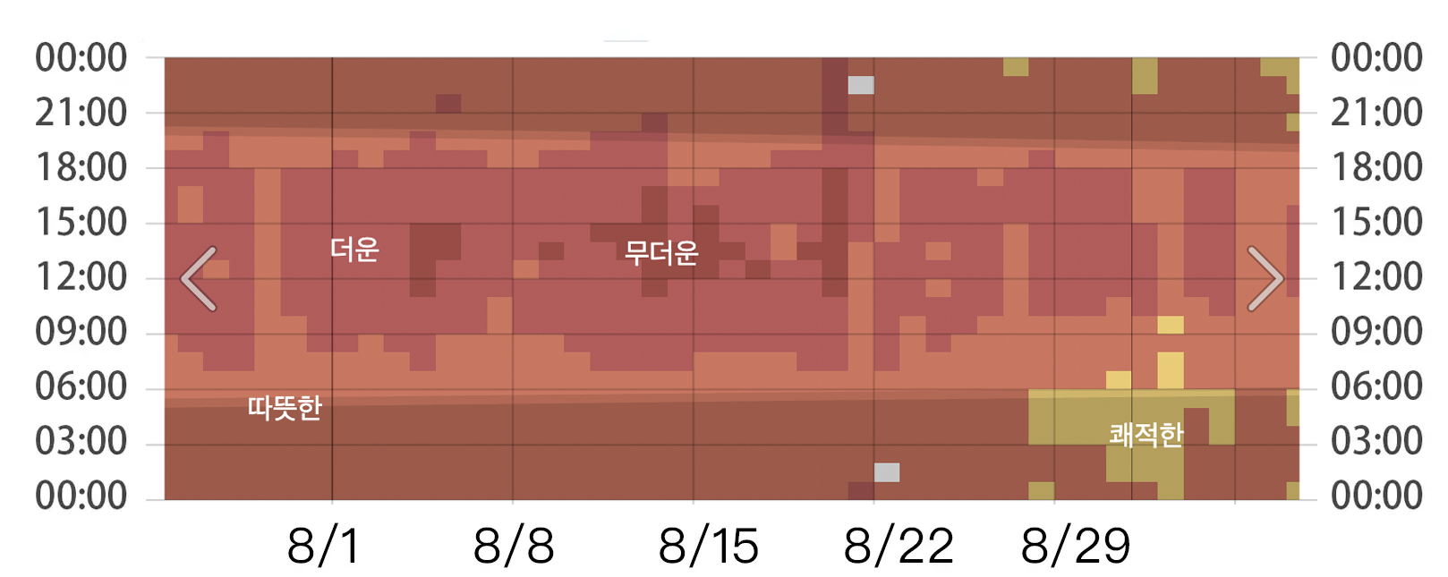 首爾08月還是熱,在上旬、中旬的09:00至18:00都還是很熱(上圖深紅色),不過從08月下旬起開始,也剛好是三伏天過去的時候,熱的時候就沒月初那麼誇張。
