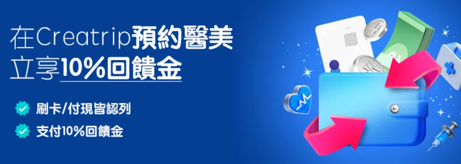 但別擔心,Creatrip提供非常多醫美診所的10%回饋制度,你在醫院刷了多少錢,我們就把該金額的10%回饋給你,就算醫美不再有退稅,也能同樣省更多!感興趣的朋友記得點擊下方資訊。