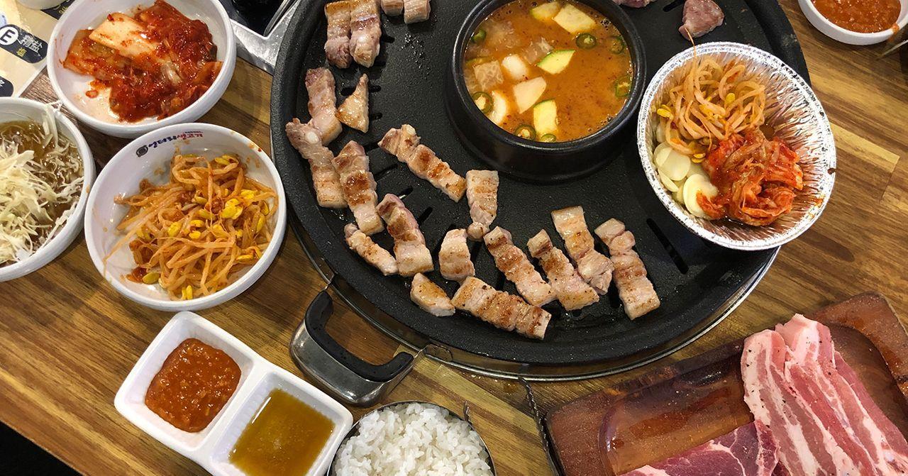 韓式燒烤餐桌圖片,展示了傳統韓國料理的多樣小菜和用餐方式。