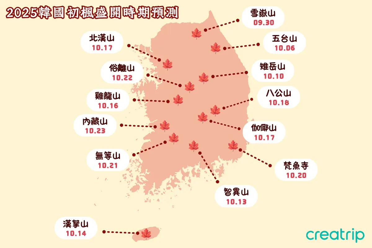 韓國楓葉初楓預測已經出爐,可以清楚看到2025年韓國第一波楓葉將落在09月底,在雪嶽山開始轉紅,從這之後將以每日往南20至25公里的速度,遍至韓國各地。