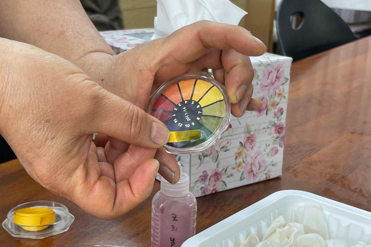Как только у нас был базовый цвет, инструктор проверил кислотно-щелочной баланс, чтобы мы могли увидеть, был ли наш начальный цвет нейтральным.