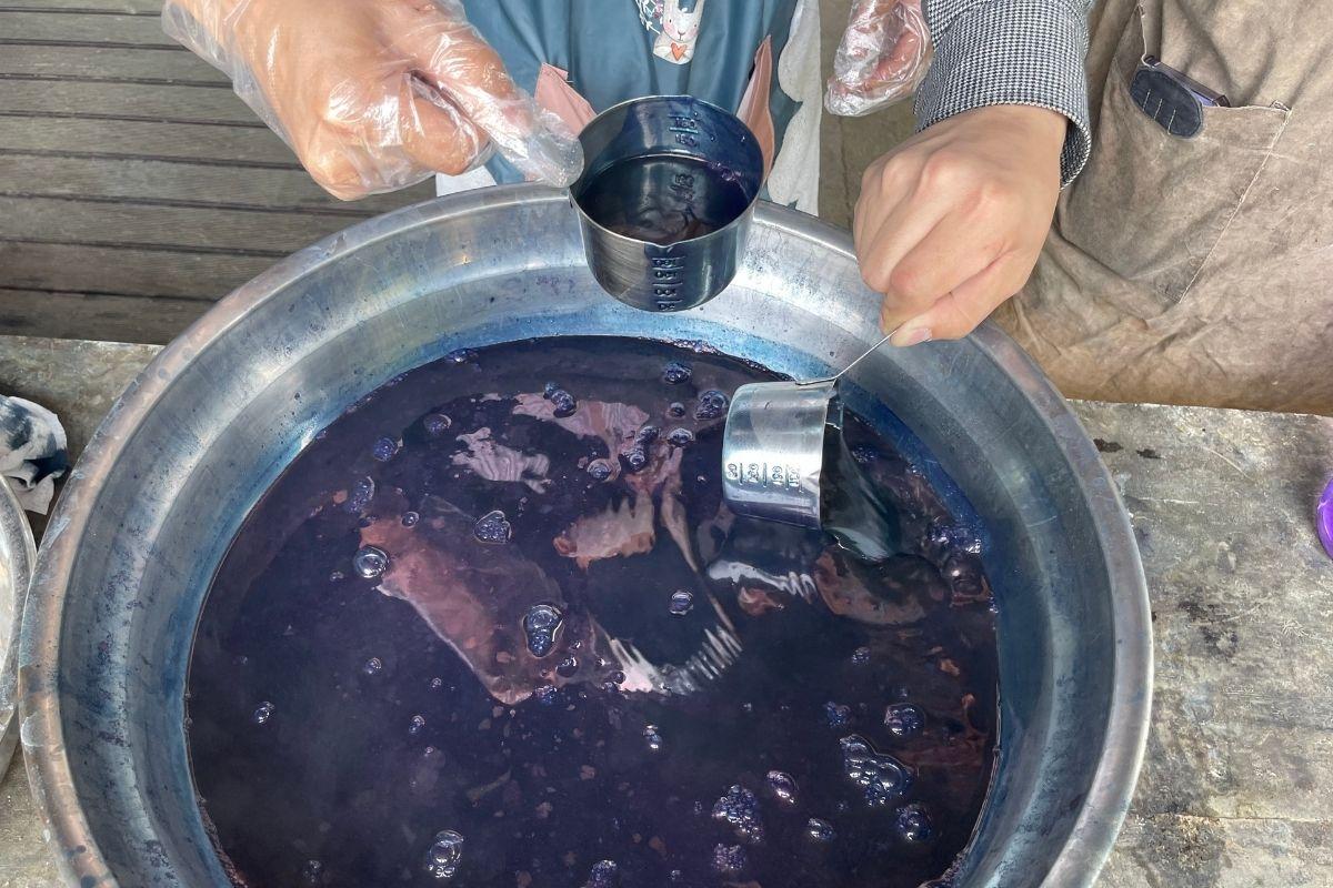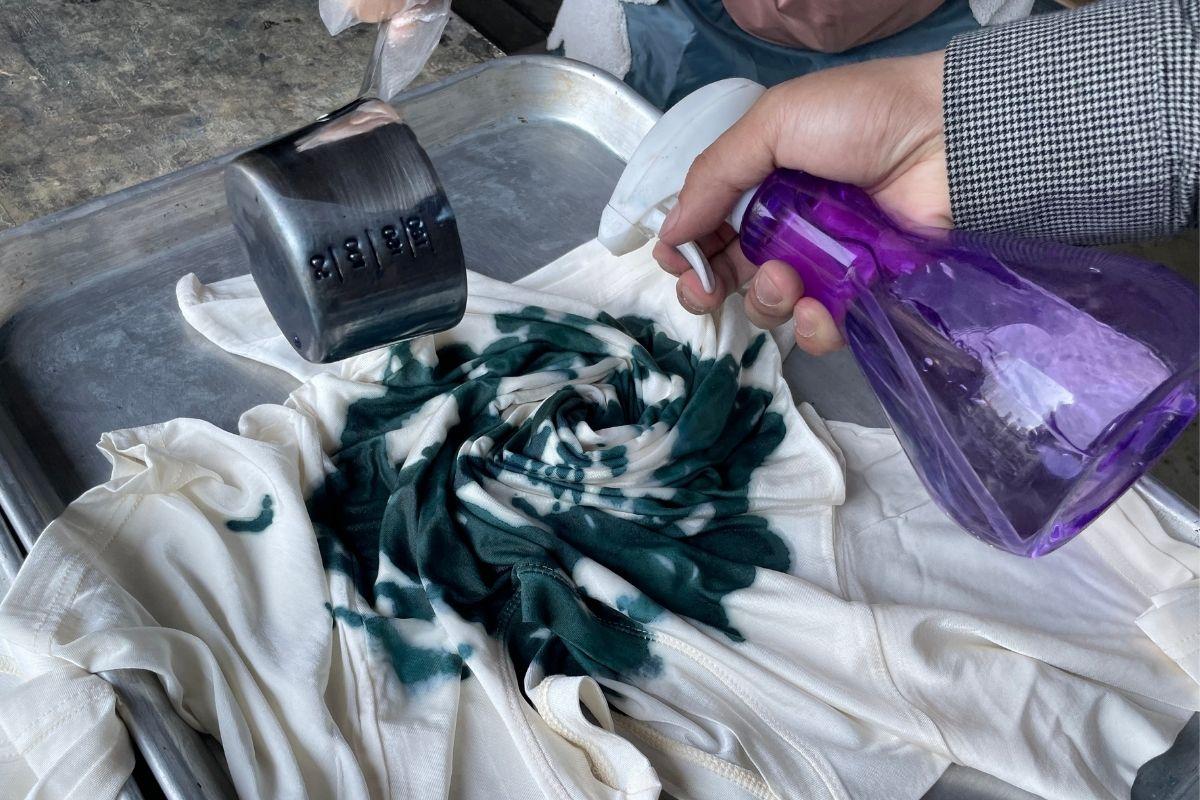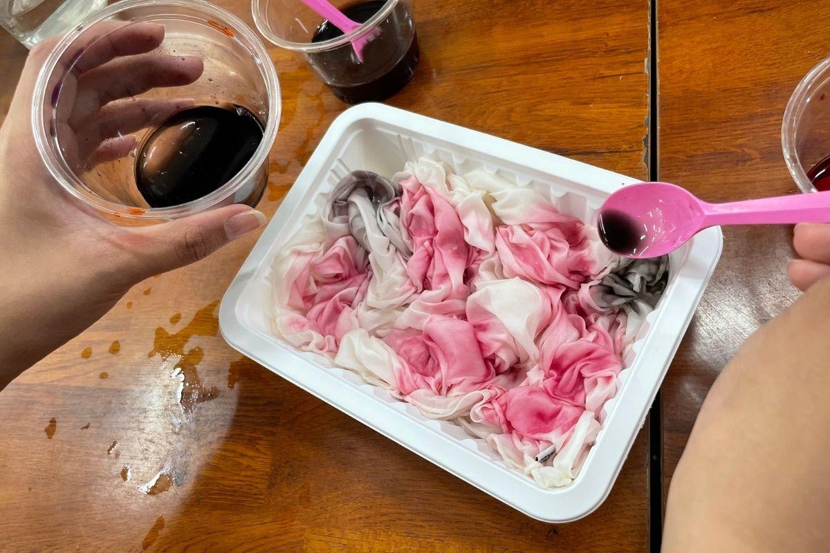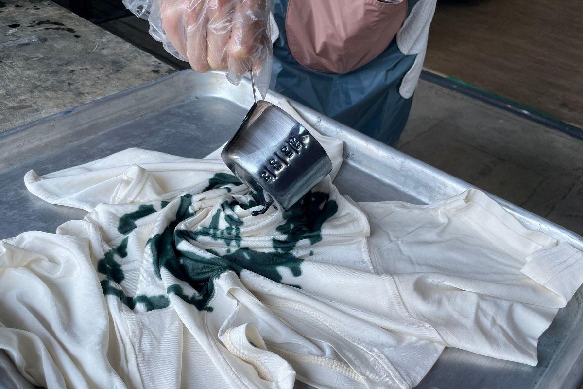 Когда это будет сделано, мы дадим ткани впитать цвет. Пока мы ждем шарф, учитель предложил попробовать покрасить рубашку вместе.