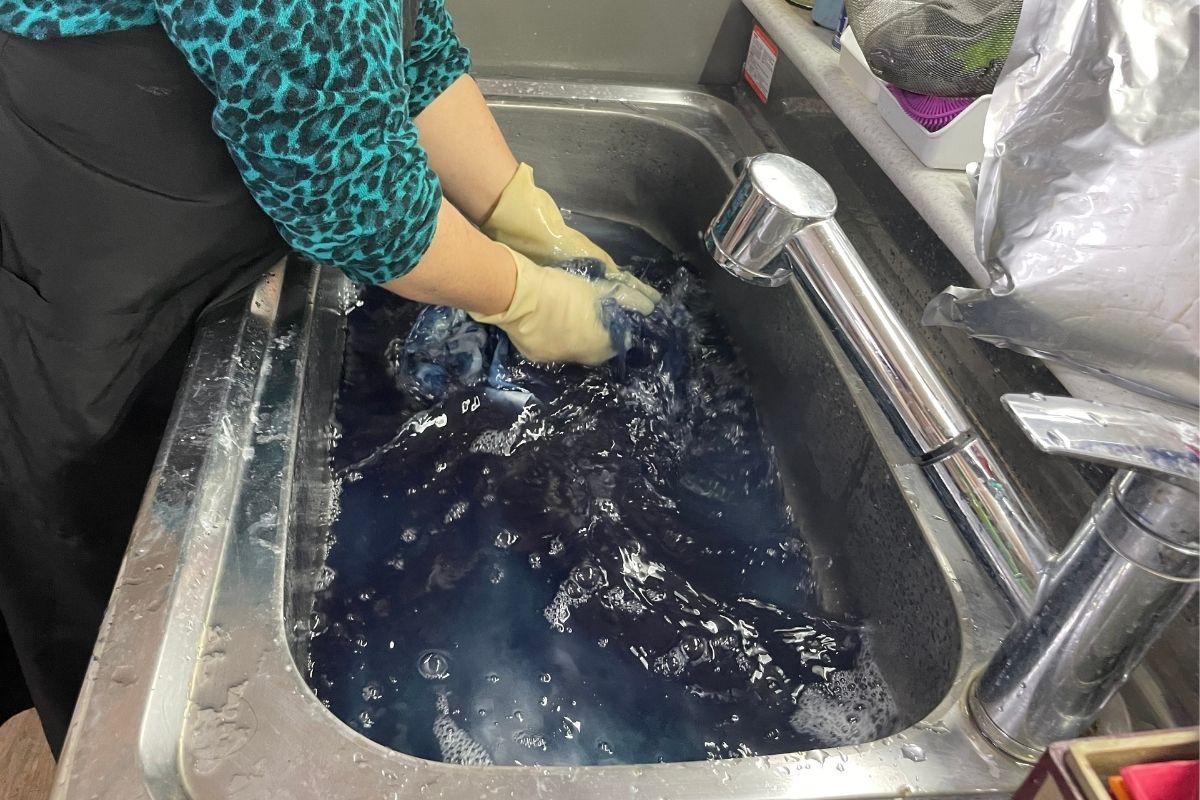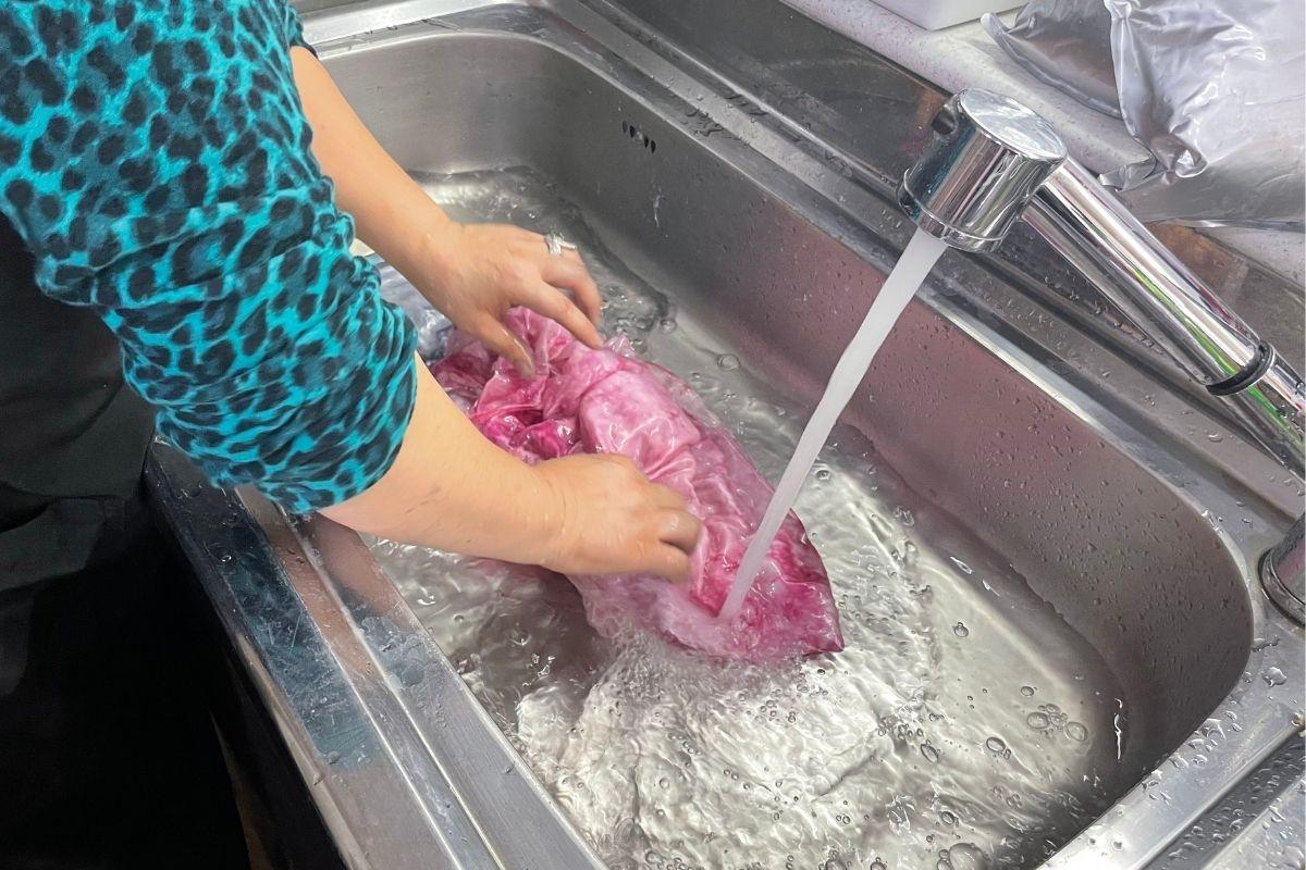 Полоща, мы смываем оставшуюся краску, которая не впиталась в ткань. Можете мыть столько, сколько нужно, чтобы цвет выцвел до желаемого оттенка.