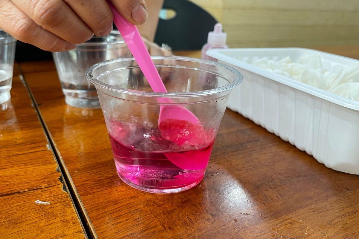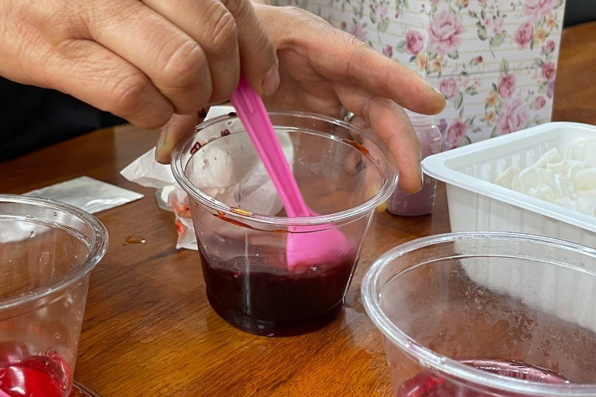 Как только у нас будут готовы все краски, наступит время окрашивать наши шарфы. Метод окрашивания, который мы будем использовать, заключается в том, чтобы зачерпнуть краску и вылить ее на то место, где мы хотим. Мы можем сами выбрать, сколько и какого цвета мы хотим.