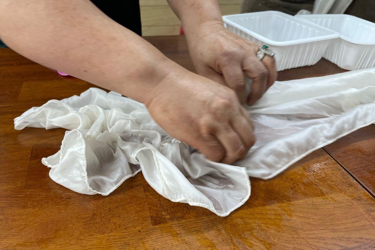 Каждый шаг выполнения показывает инструктор первым, так что вы можете следовать ему, не ошибаясь. Первый шаг — побрызгать водой на наш атласный материал и свернуть ткань в комки по разным углам.