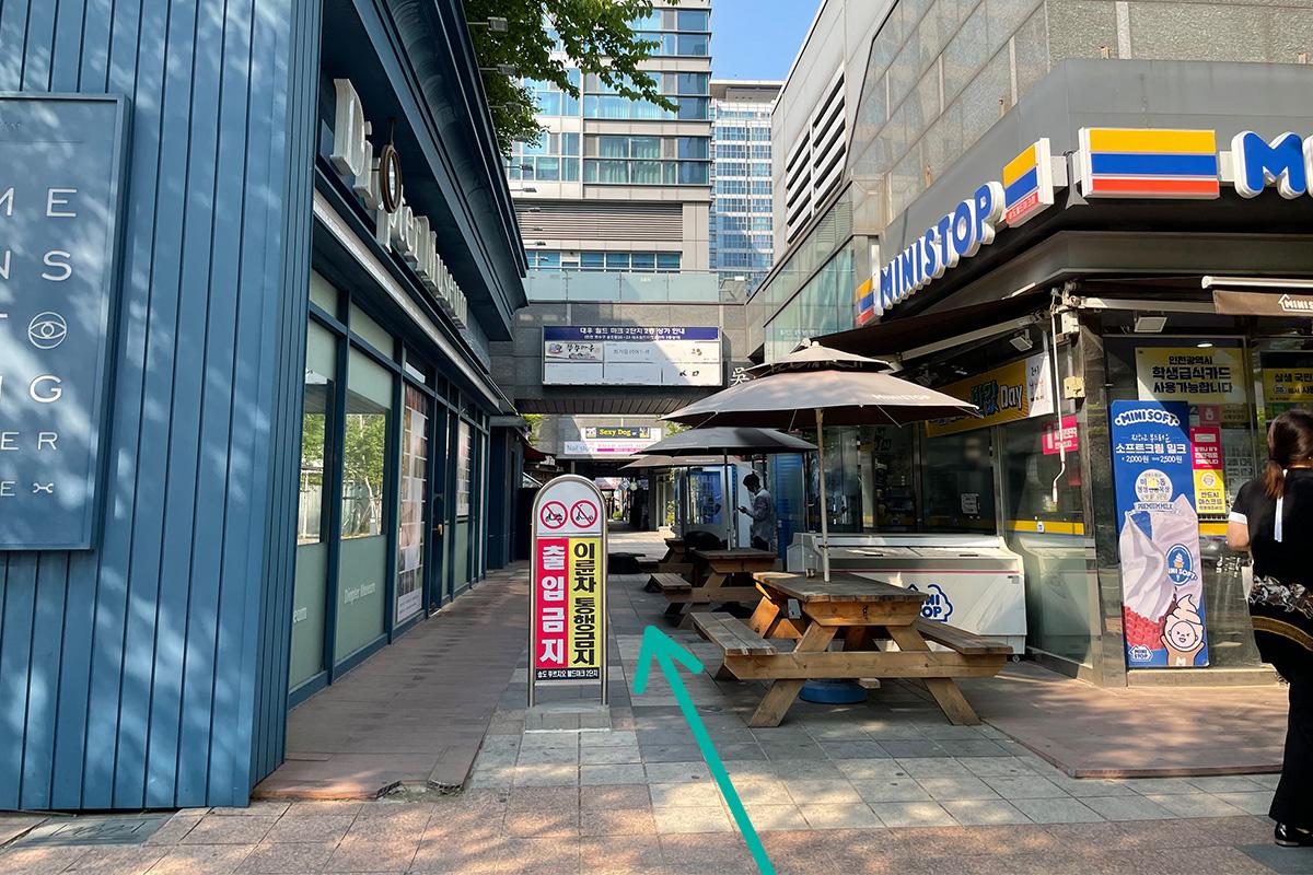 Идите в переулок слева от Ministop за автобусной остановкой Prugio Worldmark.