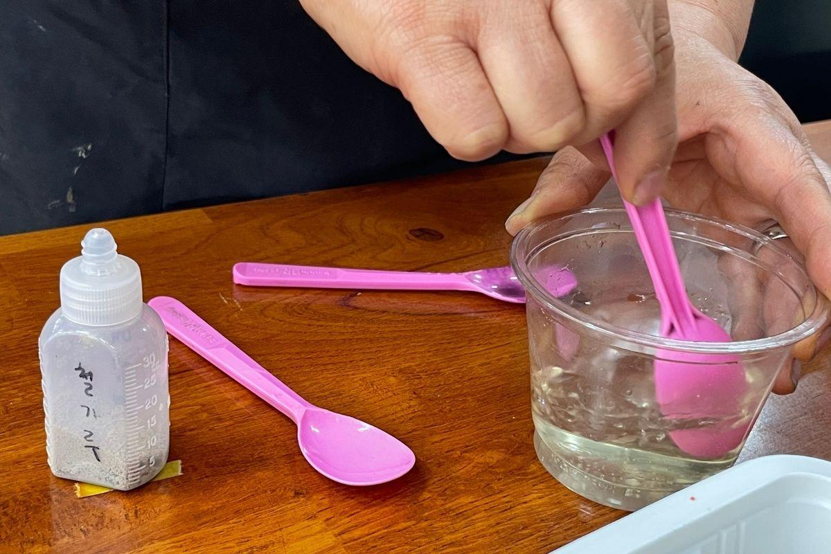 Первый стакан, который мы сделаем, это смешать в него натуральный порошок.