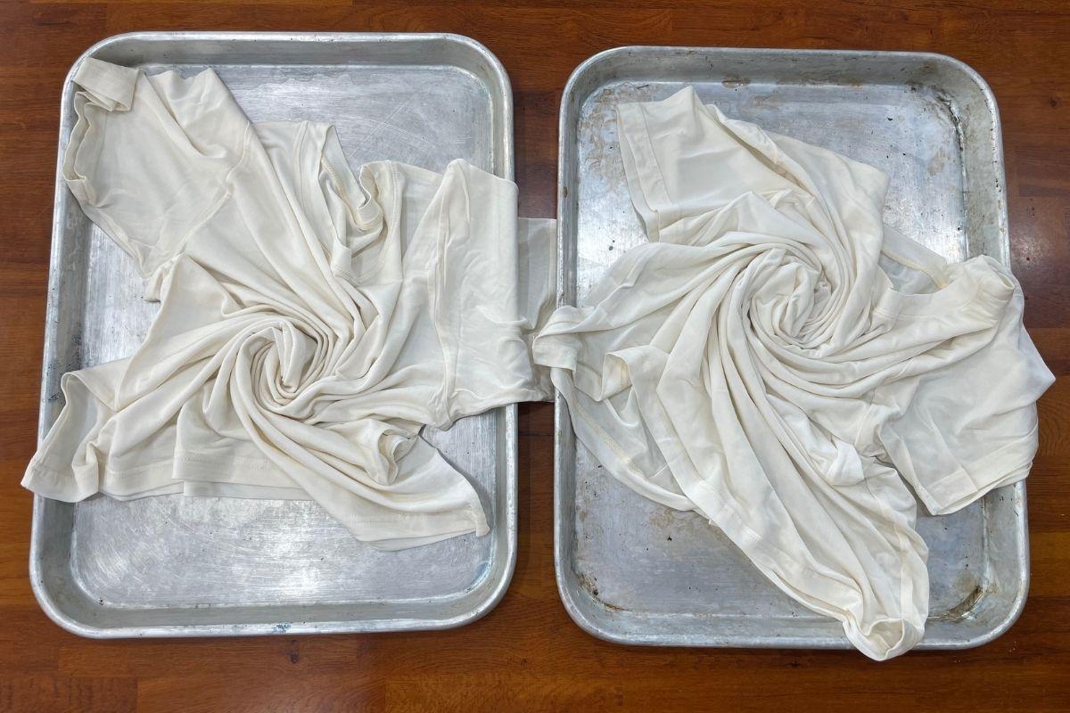 Когда ткань будет готова, мы переместим материал, чтобы поместить его в коробку для подготовки к окрашиванию на следующем этапе.