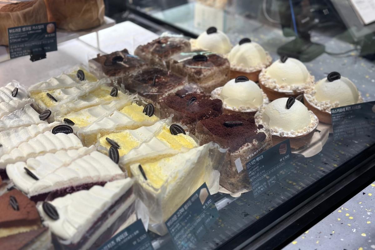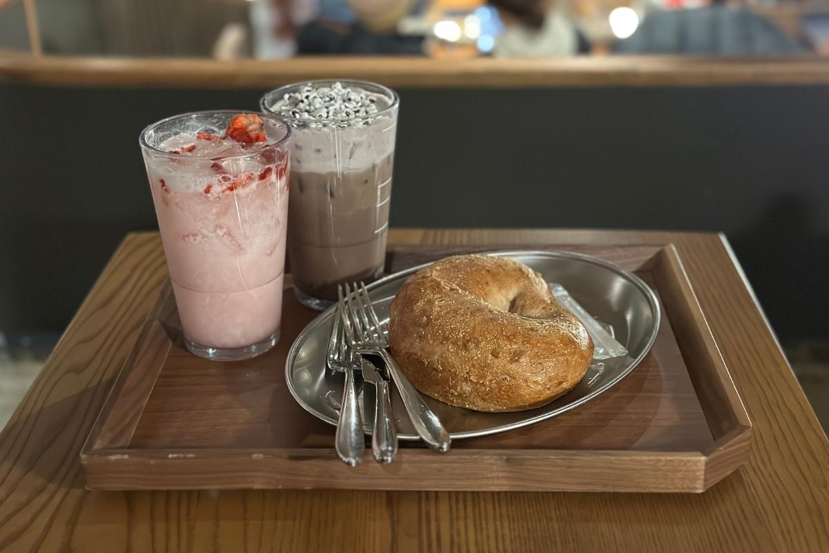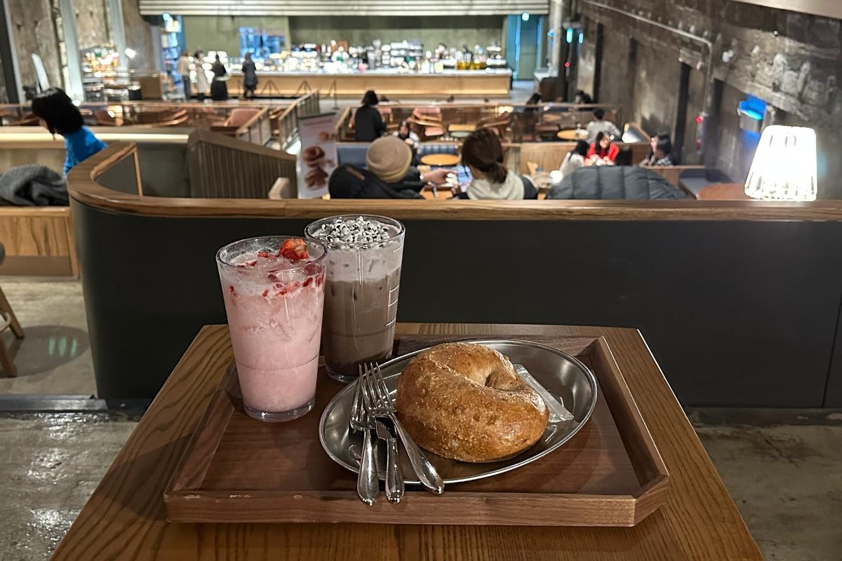 Мы заказали Хани Чиз Волт Бреад (6,900 KRW) с меню особого ресторана Кюнгдон 1960, Мороженый Черный Рис Латте (6,800 KRW) с сезонного меню и Розовый Напиток с Клубничным Асаи Старбакс Рефрешерс (6,400 KRW).
