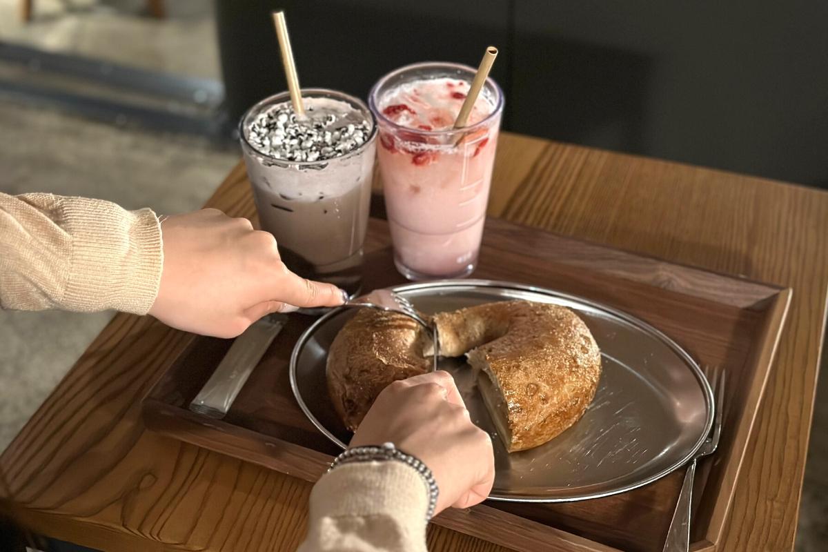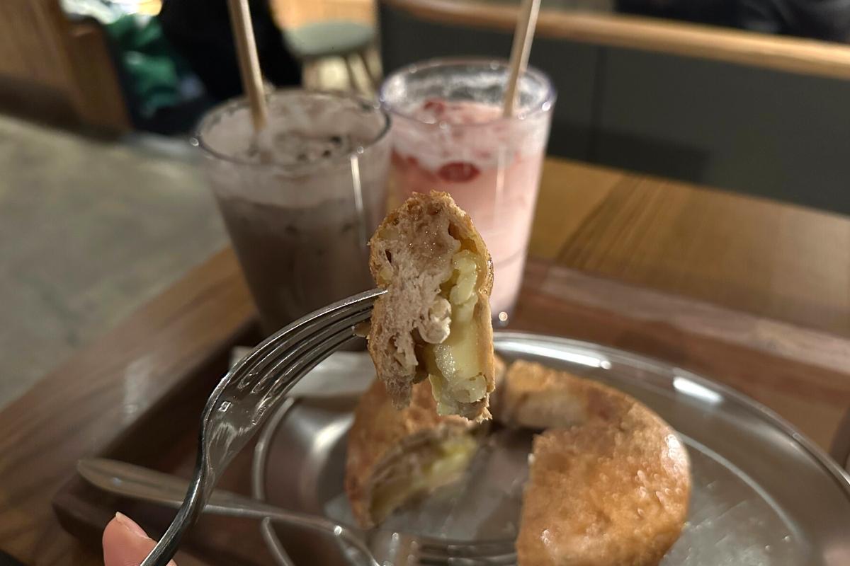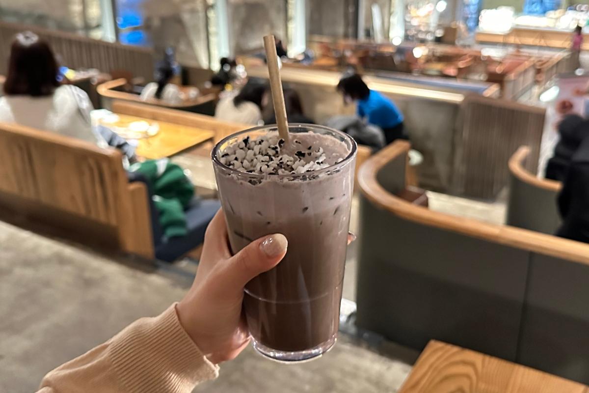 Затем мы попробовали наши напитки. Сезонный ледяной латте из черного риса был кремовым и гладким, с уникальным вкусом сладкого риса. Даже был слой взорванного риса сверху, что добавило приятную текстуру напитку. Этот напиток является частью сезонного меню Нового года 2023 и, кажется, был вдохновлен азиатскими вкусами! Если вам нравятся сладости со вкусом риса, вам понравится это!