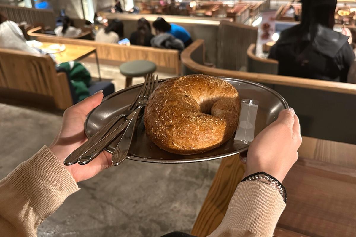 Сначала мы попробовали Медный сырный ореховый хлеб, который был большим куском хлеба в форме бублика, внутри которого было 4 разных вида сыра! В комплекте идет небольшой пакетик с акациевым медом, который вы можете намазать на хлеб.