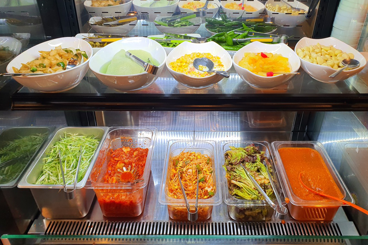 Есть кимчи, проростки фасоли, зеленый лук, чеснок, маринованная редька, салат из макарон с кукурузой и т. д.