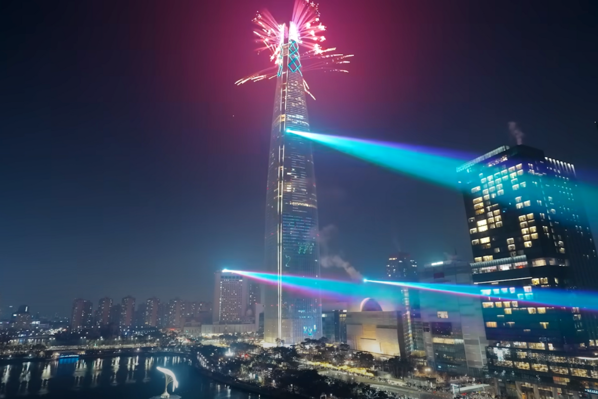 Обратный отсчет на Башне Лотте - одно из самых ярких новогодних событий в Корее, с потрясающим фейерверком и высокотехнологичным LED-шоу на культовой Башне Lotte World в Чамсиле, Сеул.