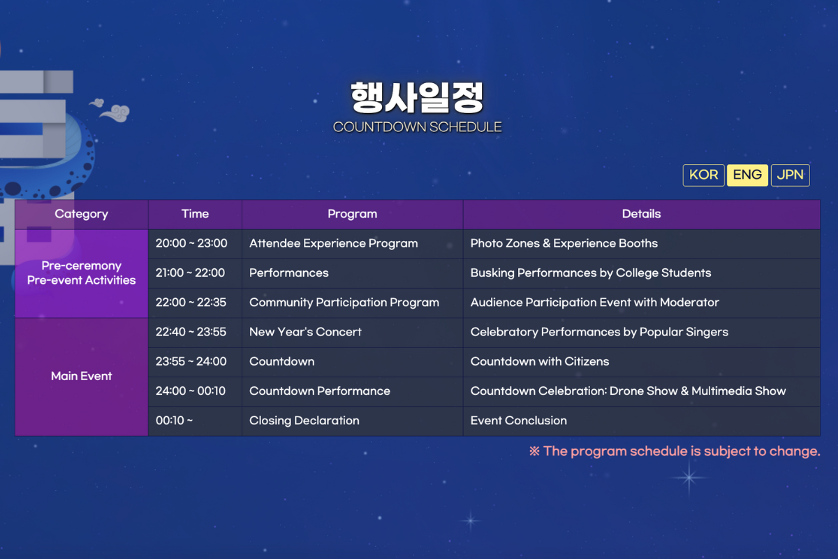 Расписание обратного отсчета Нового года: 31 декабря 2024 23:00 ~ 1 января 2025 01:30