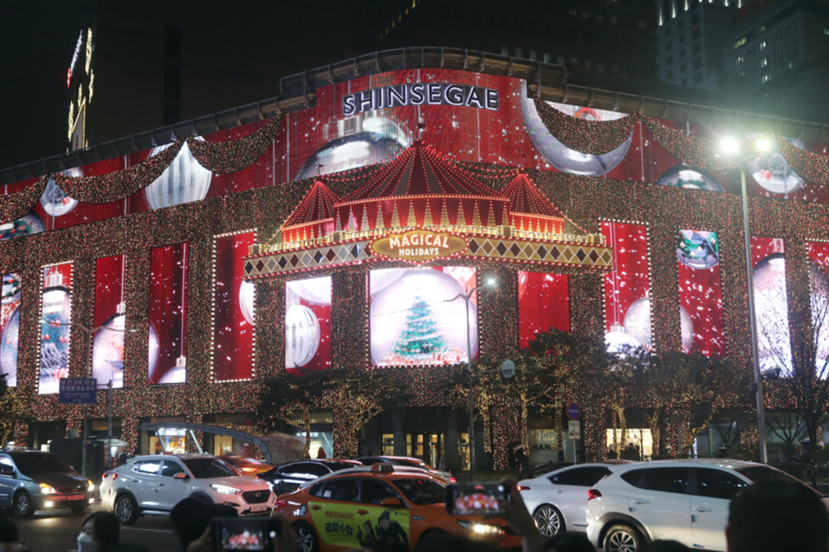 На фасаде универмага Myeongdong Shinsegae находится огромный светодиодный экран под названием Shinsegae Square, напоминающий Таймс-сквер в Нью-Йорке. Здесь можно насладиться захватывающим обратным отсчетом Нового года!