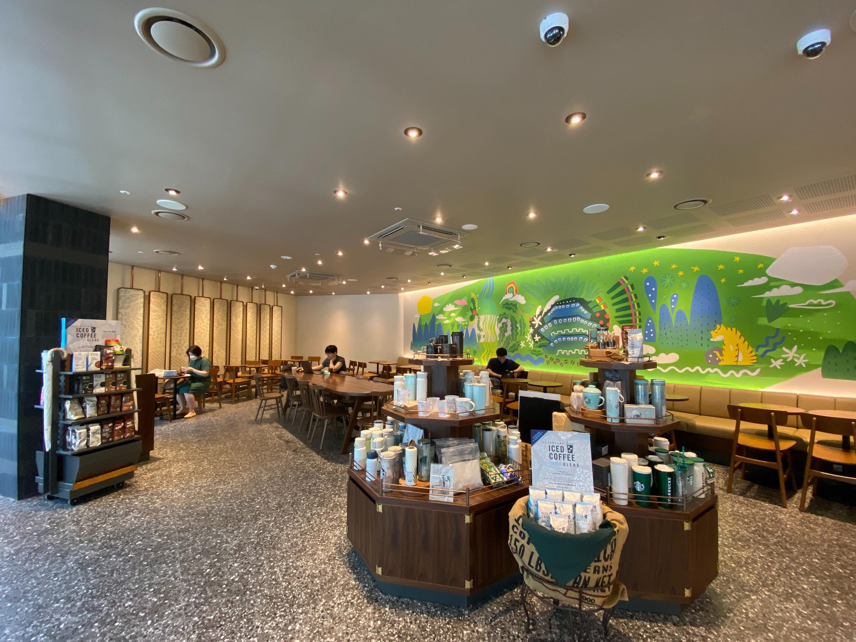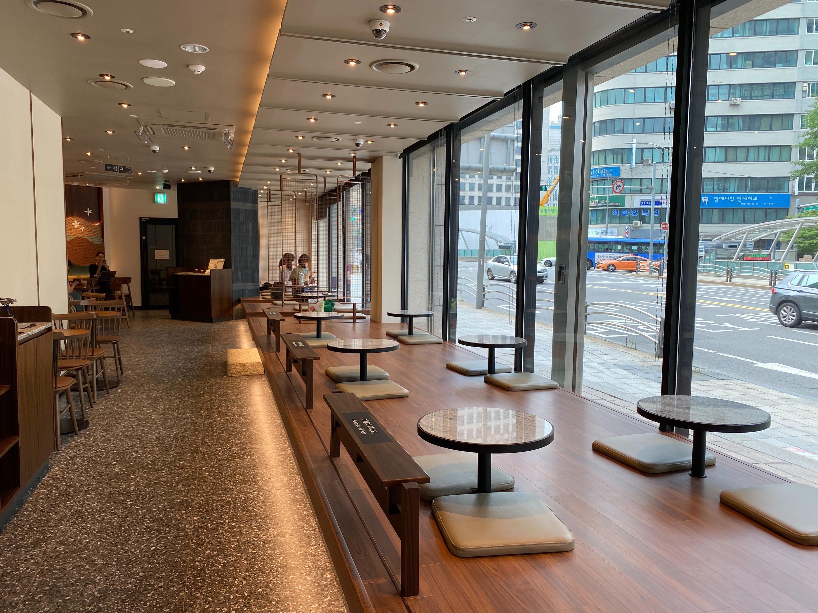 На изображении ниже — филиал Starbucks Hwangudan, расположенный недалеко от Myeongdong. Этот конкретный магазин недавно был красиво отремонтирован с настенной росписью ярких цветов, представляющей Корею, и культурой сидения на полу, которая традиционно была нормой в Корее.