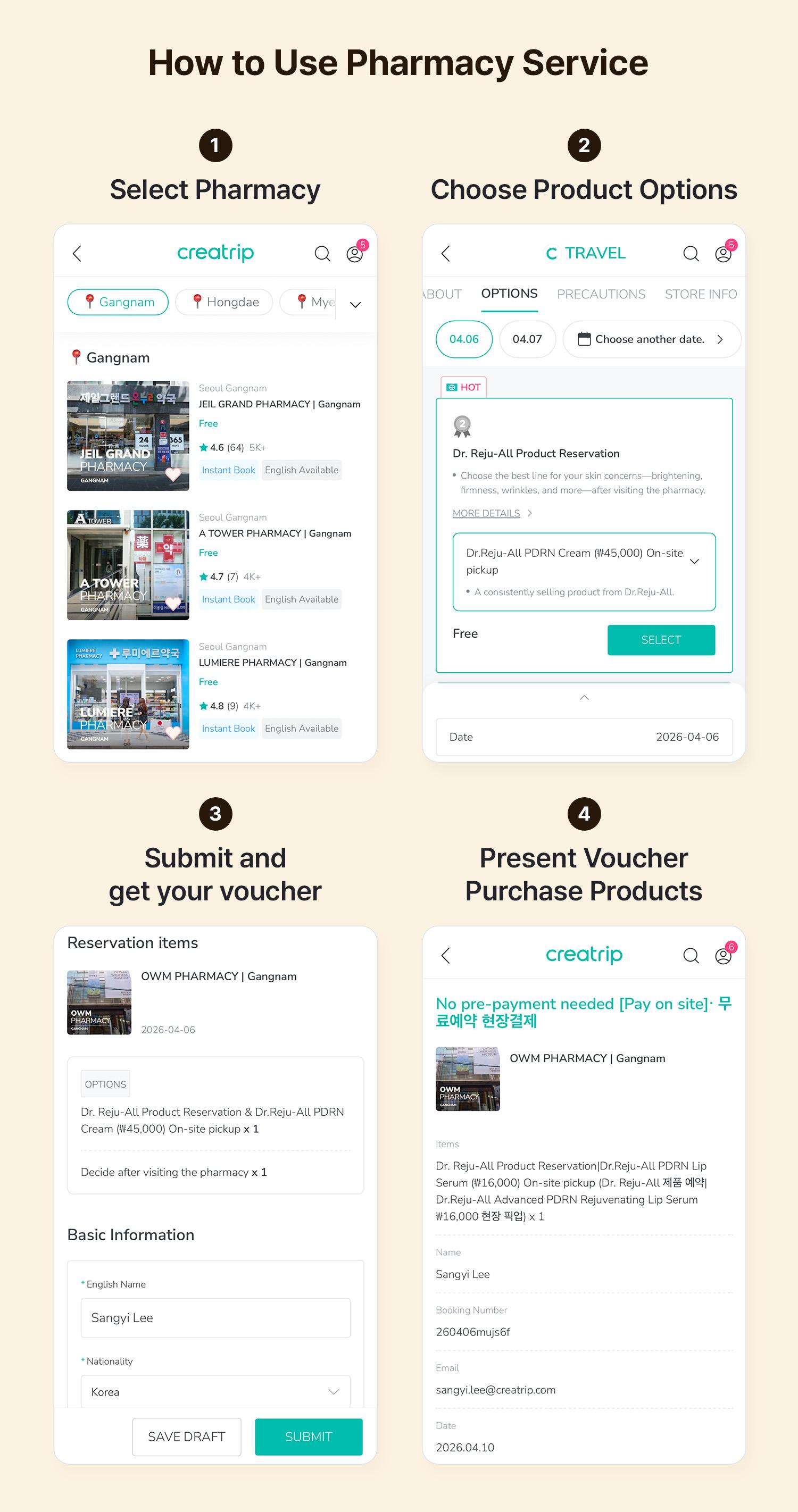 Откройте для себя эксклюзивные продукты корейских аптек, такие как Dr.Reju-All PDRN Cream, Rejuran и Acnon, в корейских аптеках, ставших важными направлениями K-beauty. Creatrip сотрудничает с аптеками в основных туристических районах, включая Мёндон, Хондэ, Каннам и Пусан, предлагая многоязычную поддержку, услуги возврата налогов, оплату международными картами и WeChat Pay.