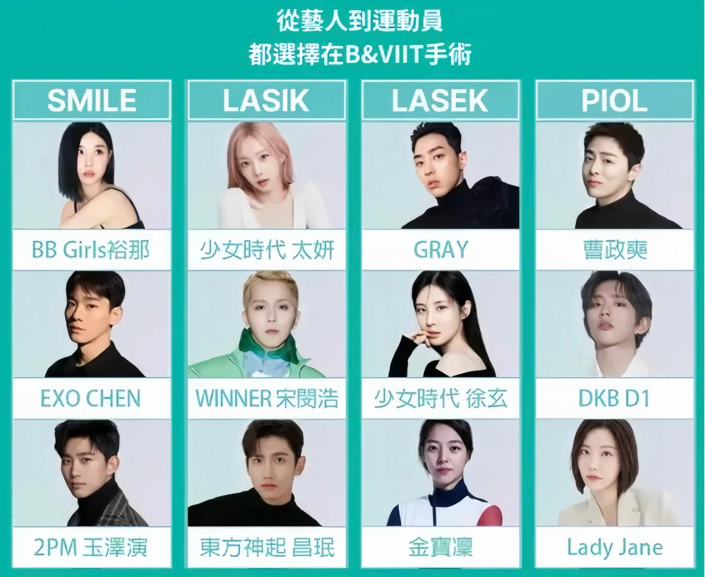 - B&VIIT眼科長年以來也累積了不少知名客群的案例,包括少女時代太妍、EXO 燦烈、THE BOYZ、2PM 玉澤演等韓國藝人,以及多位國家代表隊的運動員。