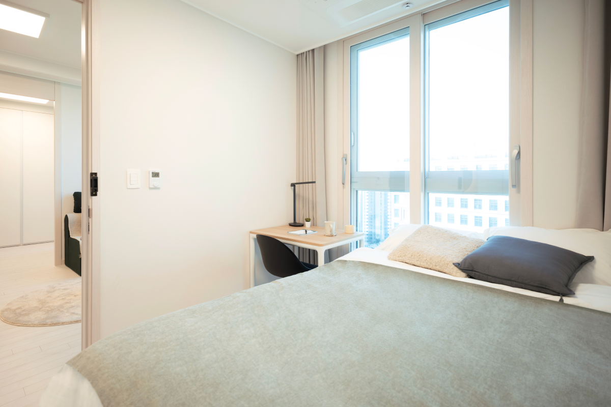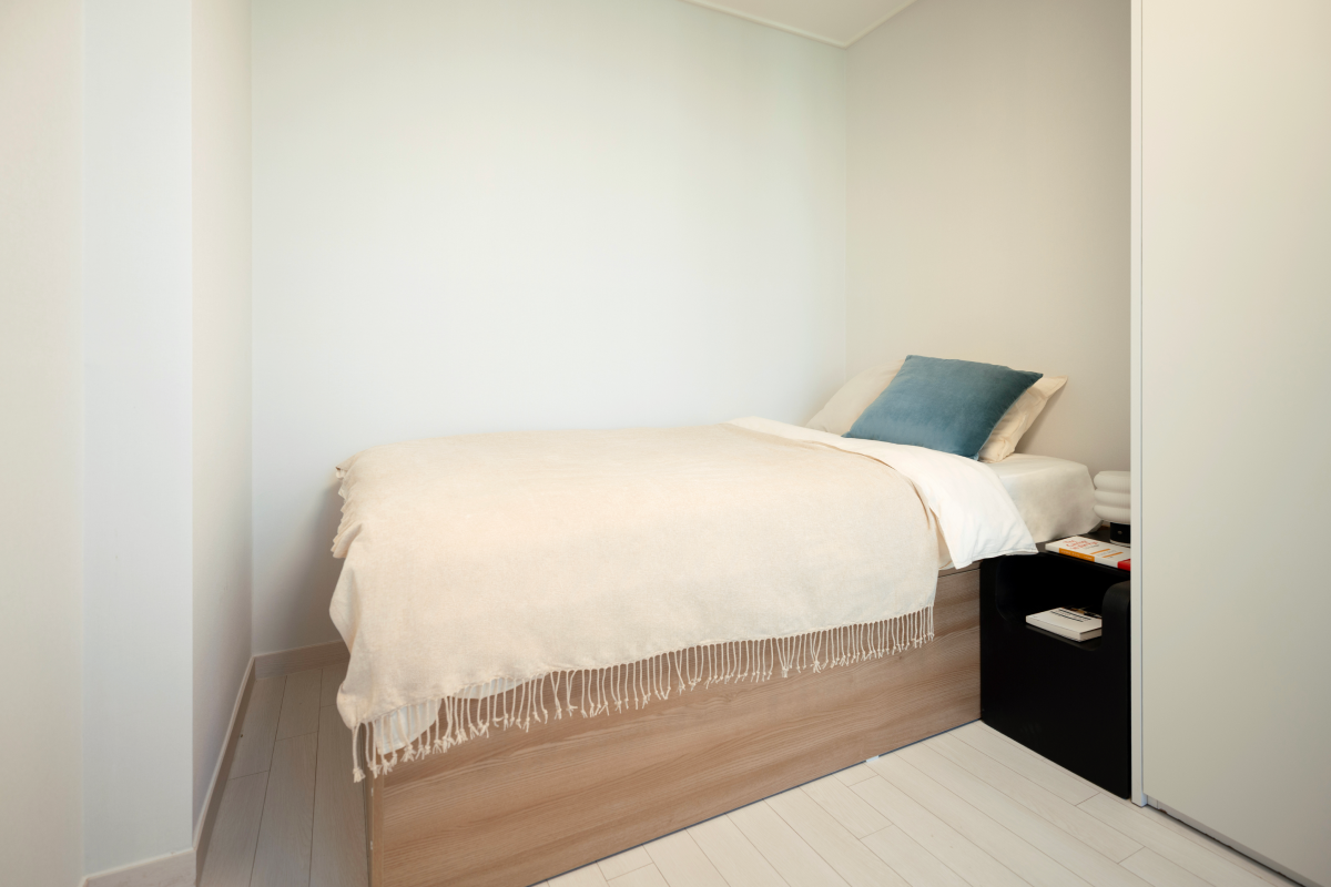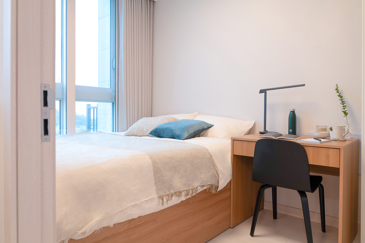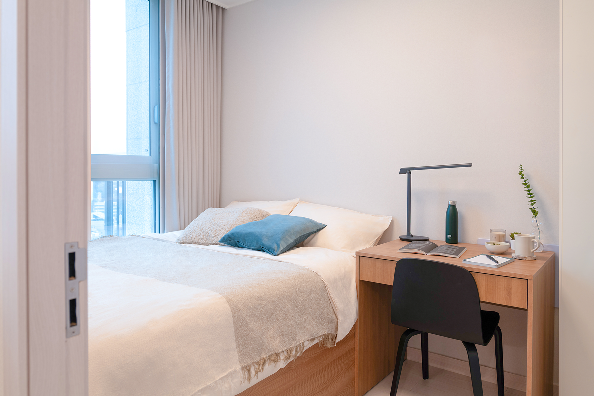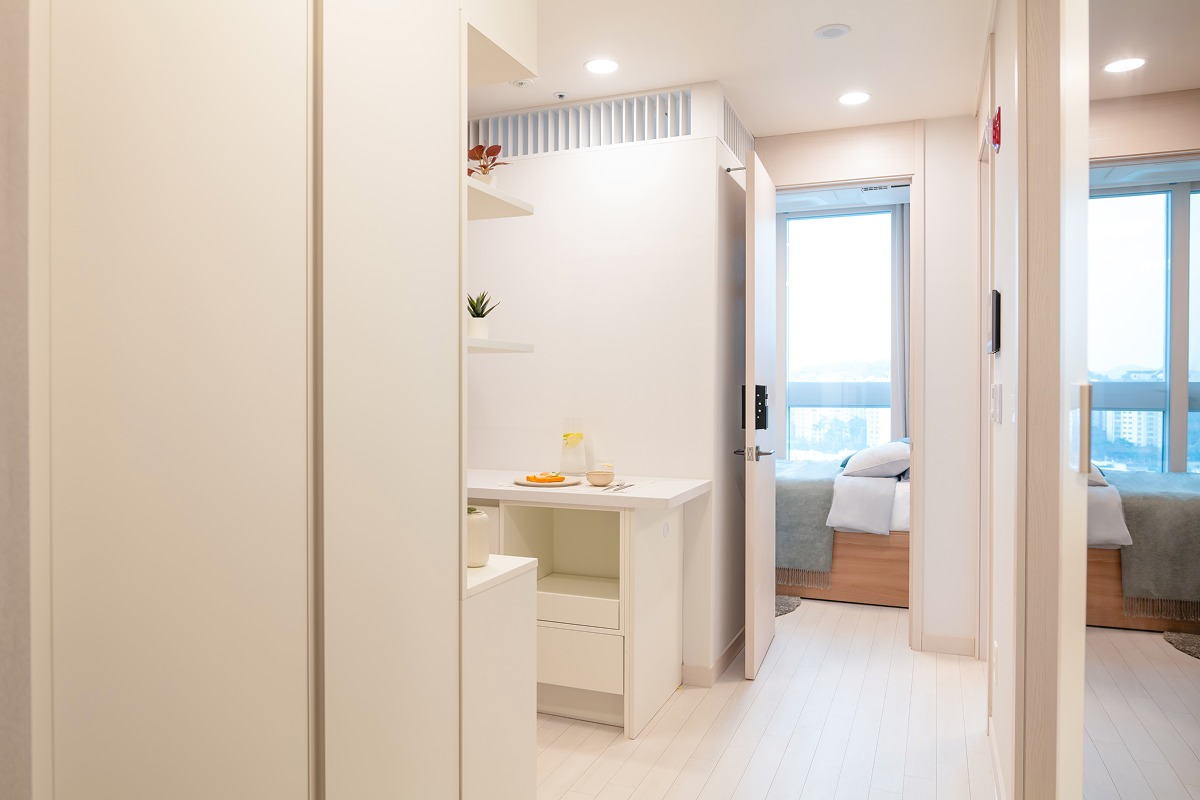 以基本家電與傢俱齊全的全配式(full-furnished)格局,入住即可生活。配有飯店等級牀鋪、收納空間、冰箱、洗脫烘一體機等主要設備,也很適合長期居住。依房型不同,廚房、浴室等部分設施會包含在房內或採共用空間方式使用,房型配置各有差異,可依個人偏好與預算選擇。