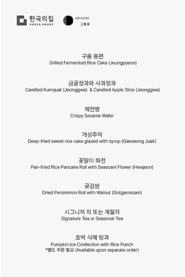 - 將朝鮮時代的宮廷茶點以現代手法重新詮釋,組成一桌,讓你一次品嚐多種韓國傳統茶點。