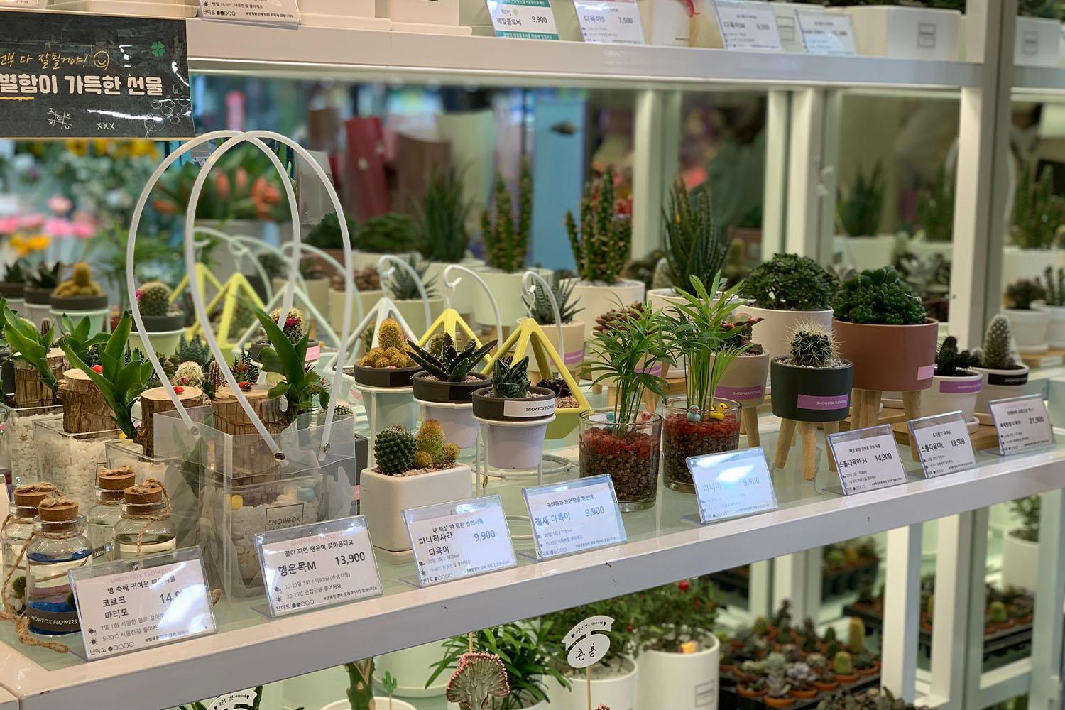ร้านดอกไม้ตั้งอยู่บนถนนสายหลักของชินชน รับรองว่าเดินทางไปได้อย่างง่ายดายเลยล่ะค่ะ นอกจากนี้ยังสามารถเห็นดอกไม้มากมายที่ถูกจัดวางไว้ด้านนอกของร้านได้ด้วยนะคะ แถมราคาก็ไม่แพงมาก และยังสามารถซื้อกระถางขนาดเล็กที่มีราคาเพียง 2,900 วอนกลับไปตกแต่งบ้านได้ด้วยค่ะ