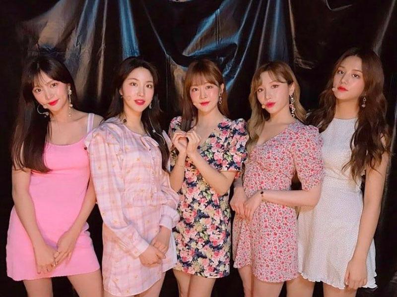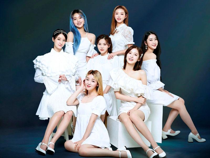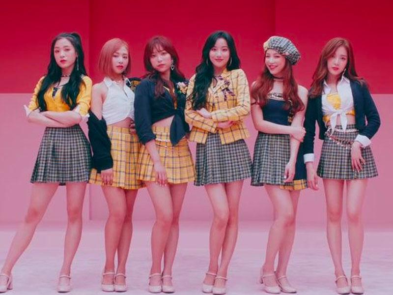 สมาชิกวง Cosmic Girls นั่งอยู่หน้าฉากพื้นหลังสีแดงสวยงาม ทุกคนใส่ชุดแฟชั่นล้ำสมัย
