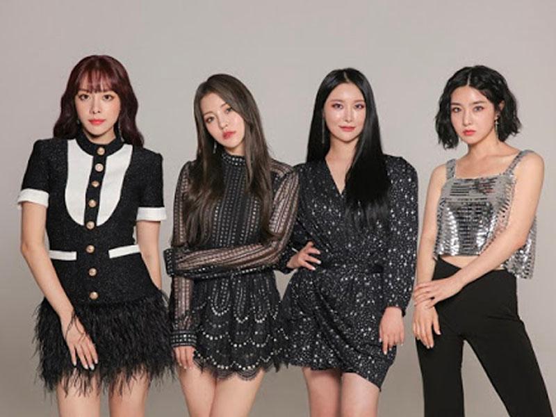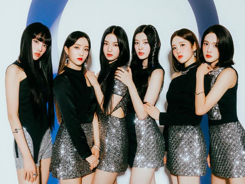Red Velvet วงเกิร์ลกรุ๊ปสุดฮิตจากเกาหลี ใส่ชุดสีดำและสีแดง โพสต์ท่าถ่ายภาพบนเวที