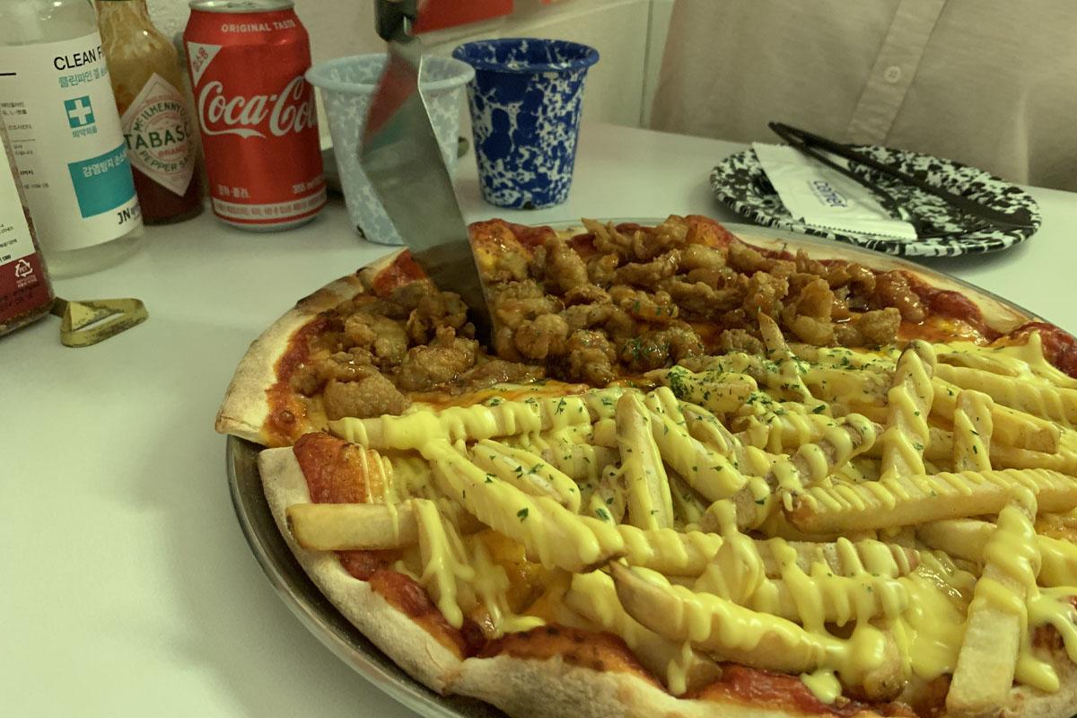 พิซซ่าหน้าหนังไก่ (닭껍질 피자)