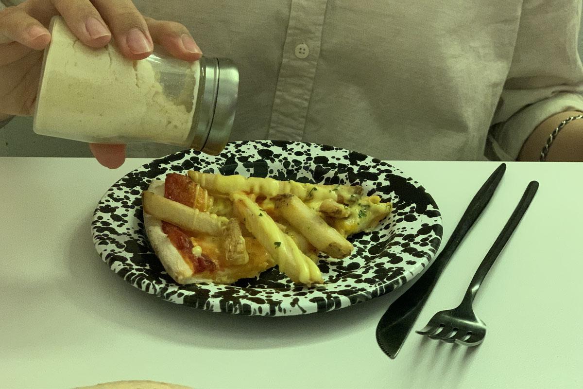 บนโต๊ะแต่ละตัวจะมีเจลทำความสะอาดมือ, ซอสเผ็ด, ชีส, พริกแดง ฯลฯ ถูกจัดวางไว้ หลังจากเลือกโต๊ะได้แล้วพนักงานก็จะนำจาน, เครื่องเคียง, และทิชชู่เปียกมาให้ค่ะ