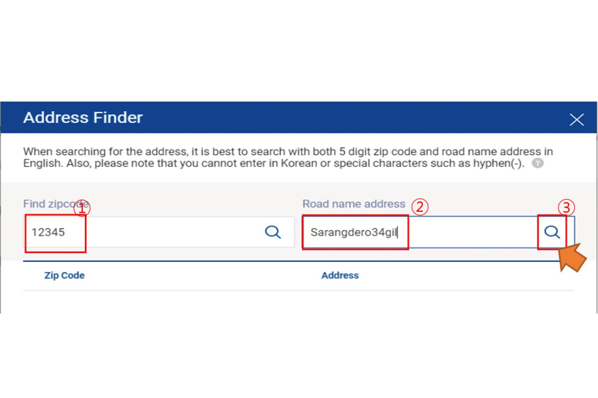 7.1.2. ใส่รหัสไปรษณีย์ 5 หลักในช่อง (1) [ในกรณีที่ไม่ทราบรหัสไปรษณีย์ สามารถหาได้จาก เว็บไซต์นี้], ถนนที่อยู่ในเกาหลีในช่อง (2) และคลิกแว่นขยายในช่อง (3) เพื่อค้นหา โดยข้อมูลทั้งหมดต้องเป็นภาษาอังกฤษ