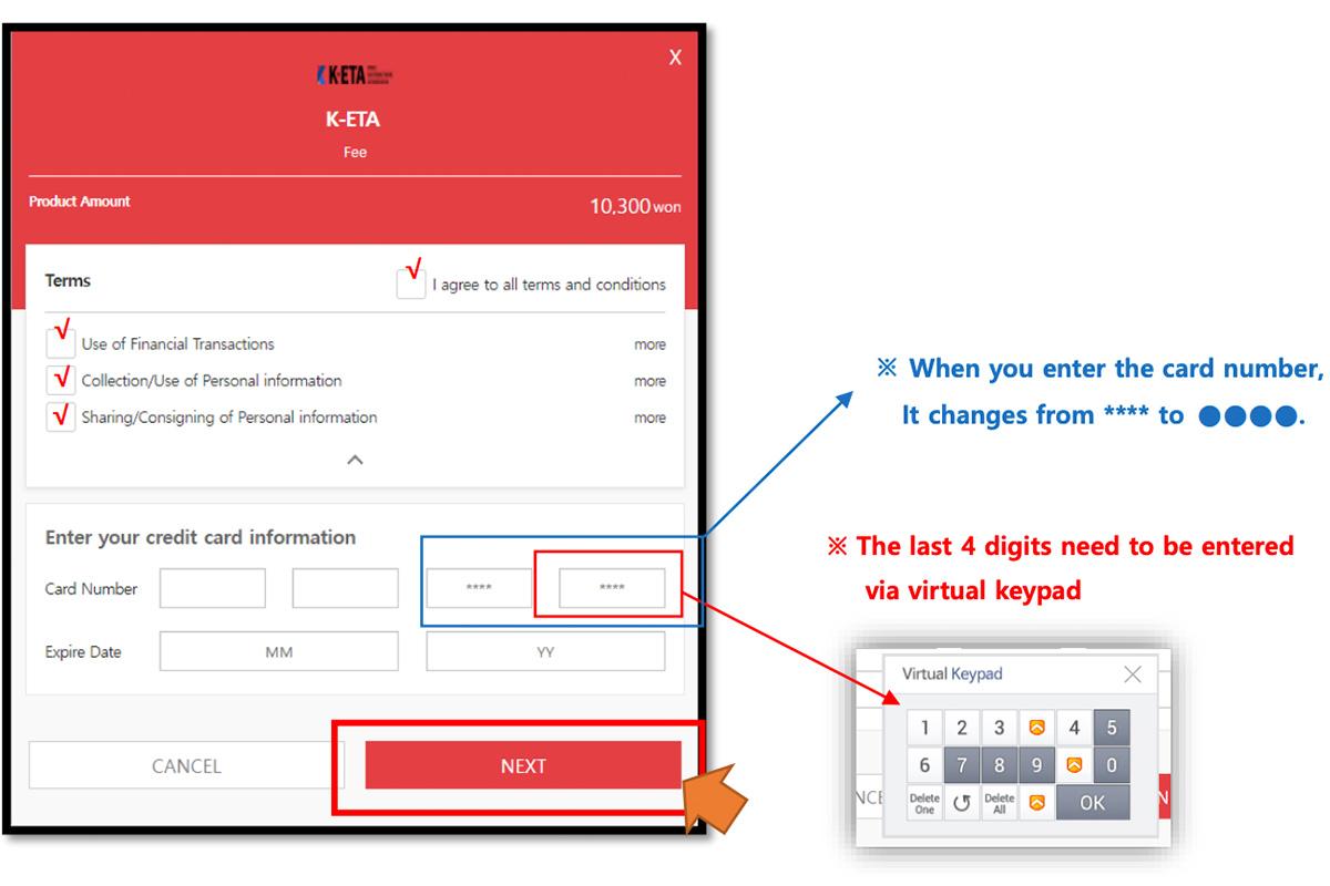 ข้อตกลงทั่วไปของ K-ETA บนหน้าเว็บไซต์พร้อมปุ่มกด Next เพื่อดำเนินการต่อ