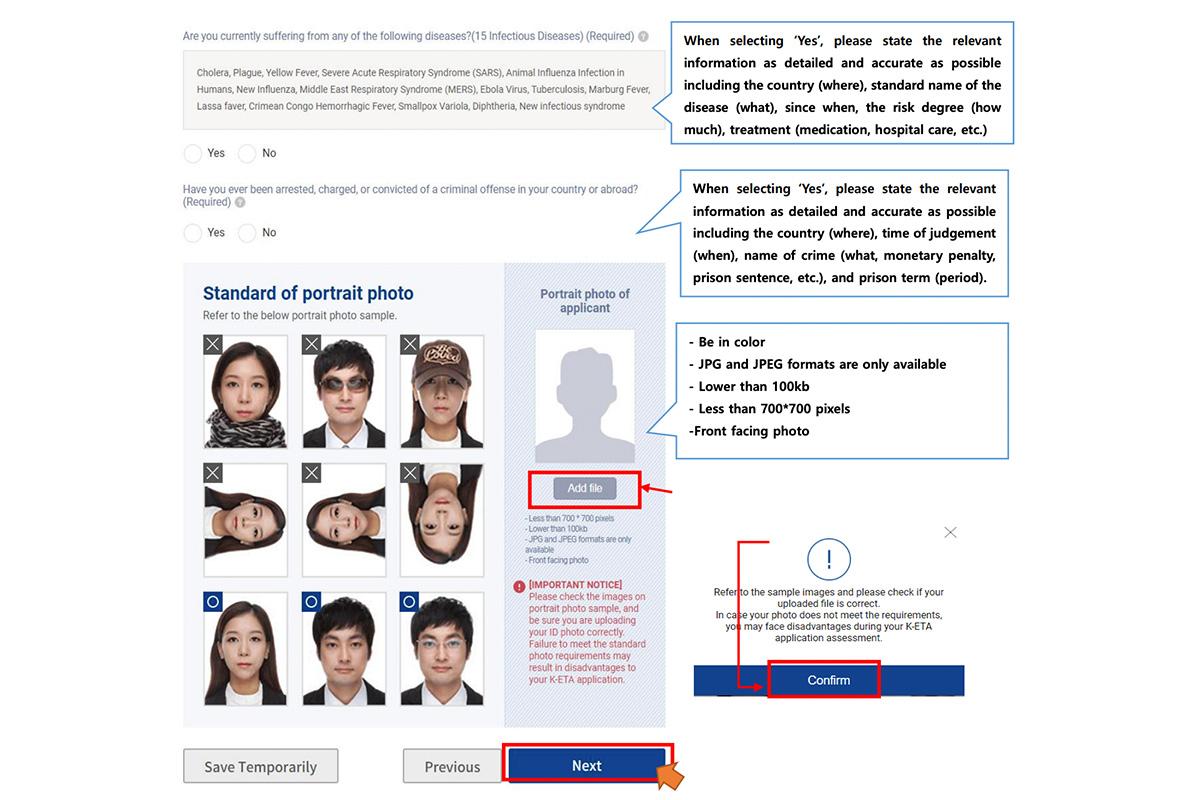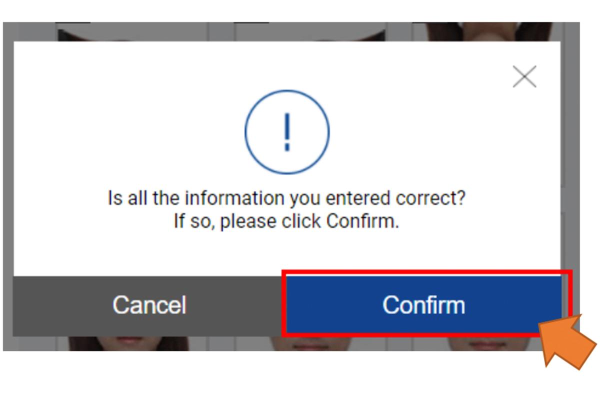 9. ใส่รูปภาพหน้าตรงโดยต้องเป็นรูปสี, สกุลไฟล์ JPG หรือ JPEG, ไม่เกิน 100kb, ขนาด 700 x 700 pixels (สามารถดูรูปตัวอย่างในแถวล่างสุดที่เป็นตัวอย่างที่ถูกต้อง) และกด "Next" สำหรับขั้นตอนต่อไป รวมถึง กด "Confirm" เพื่อยืนยันว่าข้อมูลถูกต้อง