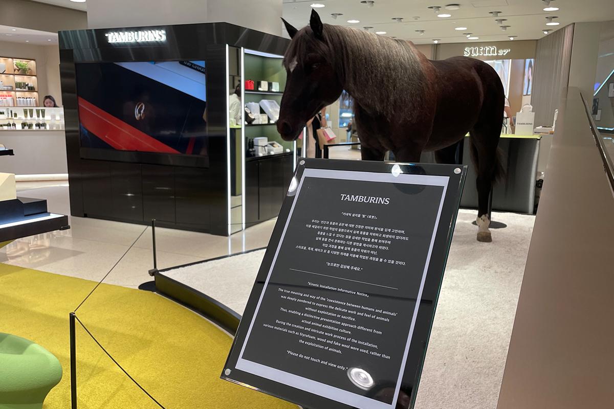 Tamburins จัดแสดงประติมากรรมม้าด้วยความคิดสร้างสรรค์ในร้านของพวกเขา สะท้อนถึงการครุ่นคิดอย่างลึกซึ้งเกี่ยวกับ 'การอยู่ร่วมกันของมนุษย์และสัตว์' โดยใช้วัสดุต่างๆ เช่น สไตโรโฟม ไม้ และขนเทียม พวกเขาเก็บรักษาแก่นแท้ของสัตว์ไว้อย่างชำนาญโดยไม่ใช้ประโยชน์จากพวกมัน การเคลื่อนไหวที่สมจริงของประติมากรรมทำให้มันน่าหลงใหลอย่างแท้จริง
