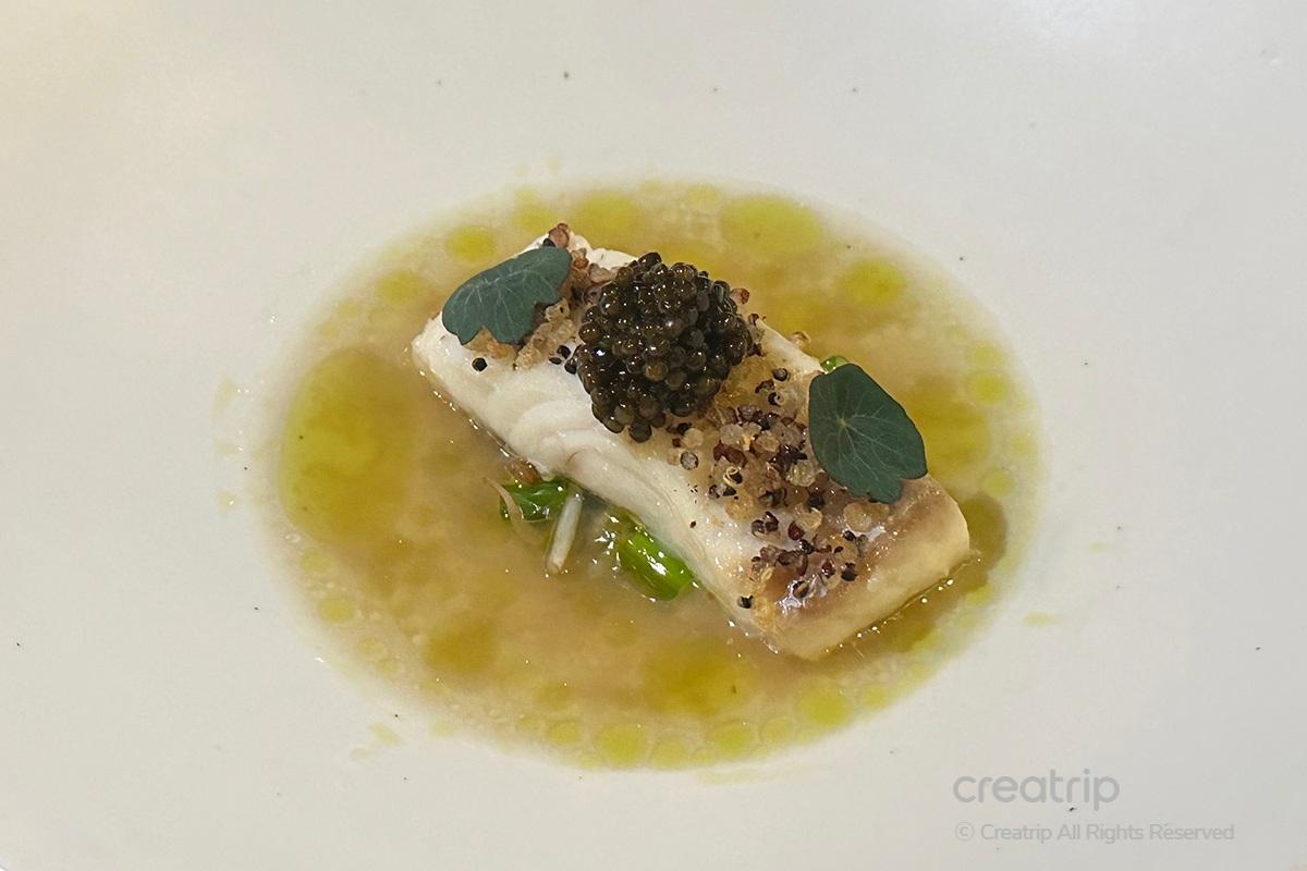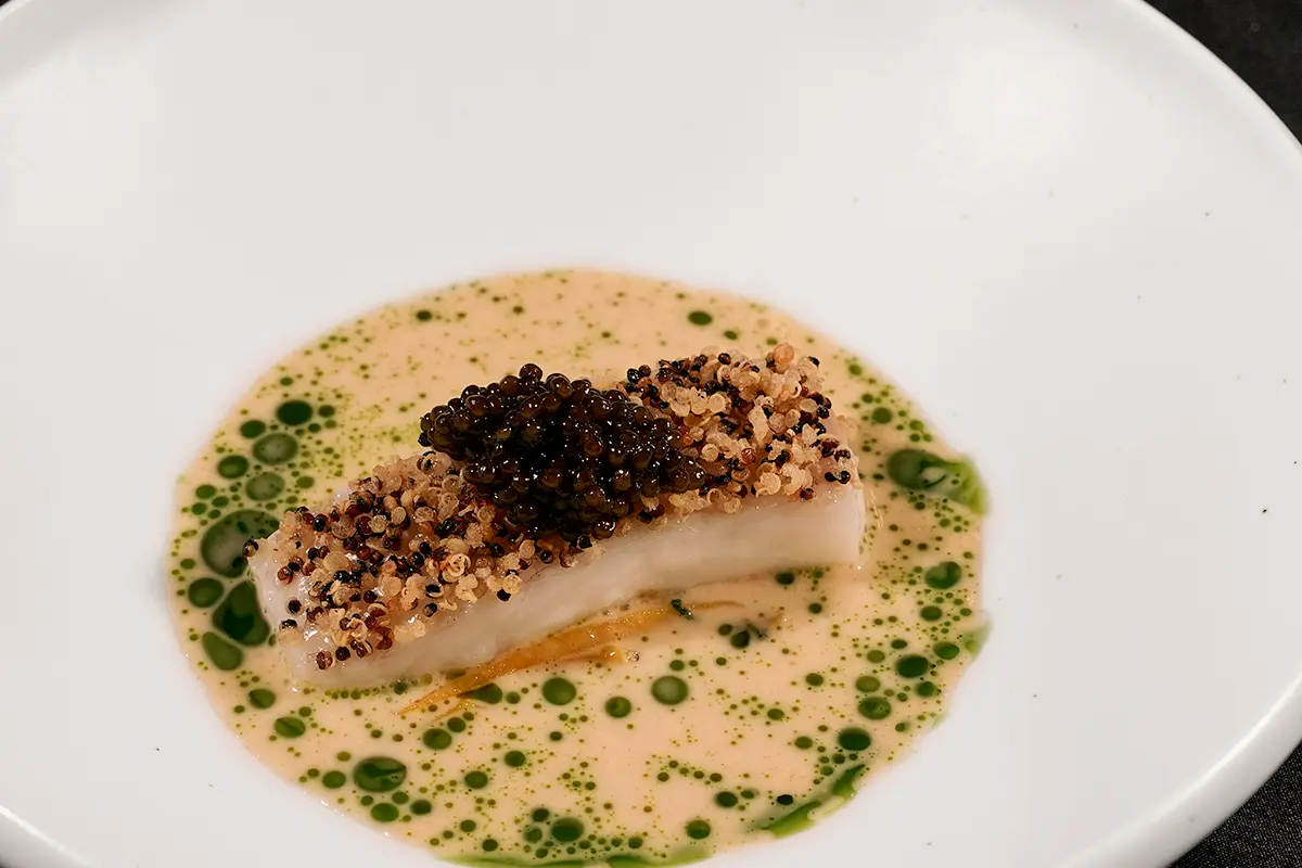 เมนูกึ่งนี้มีจานที่ประกอบด้วยปลาลิ้นหมา กุยช่าย ถั่วงอก ควินัว ต้นหอม ทาร์ทาร์ และเสจ