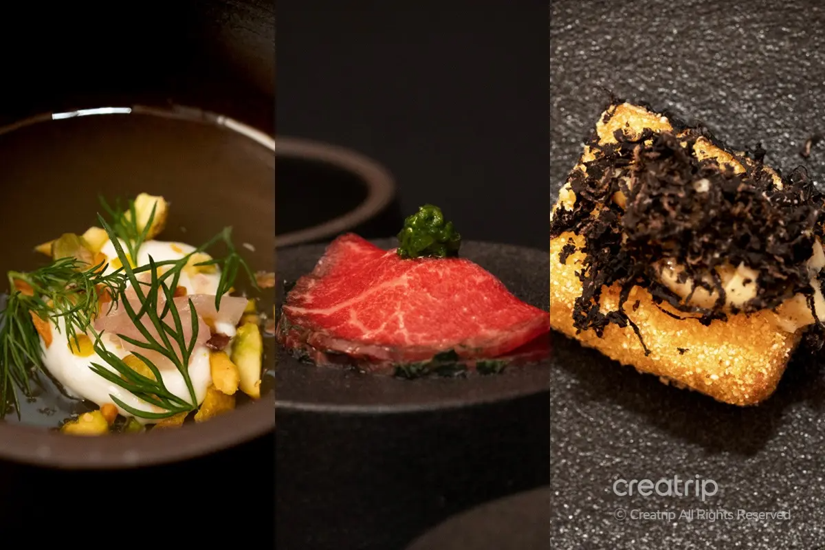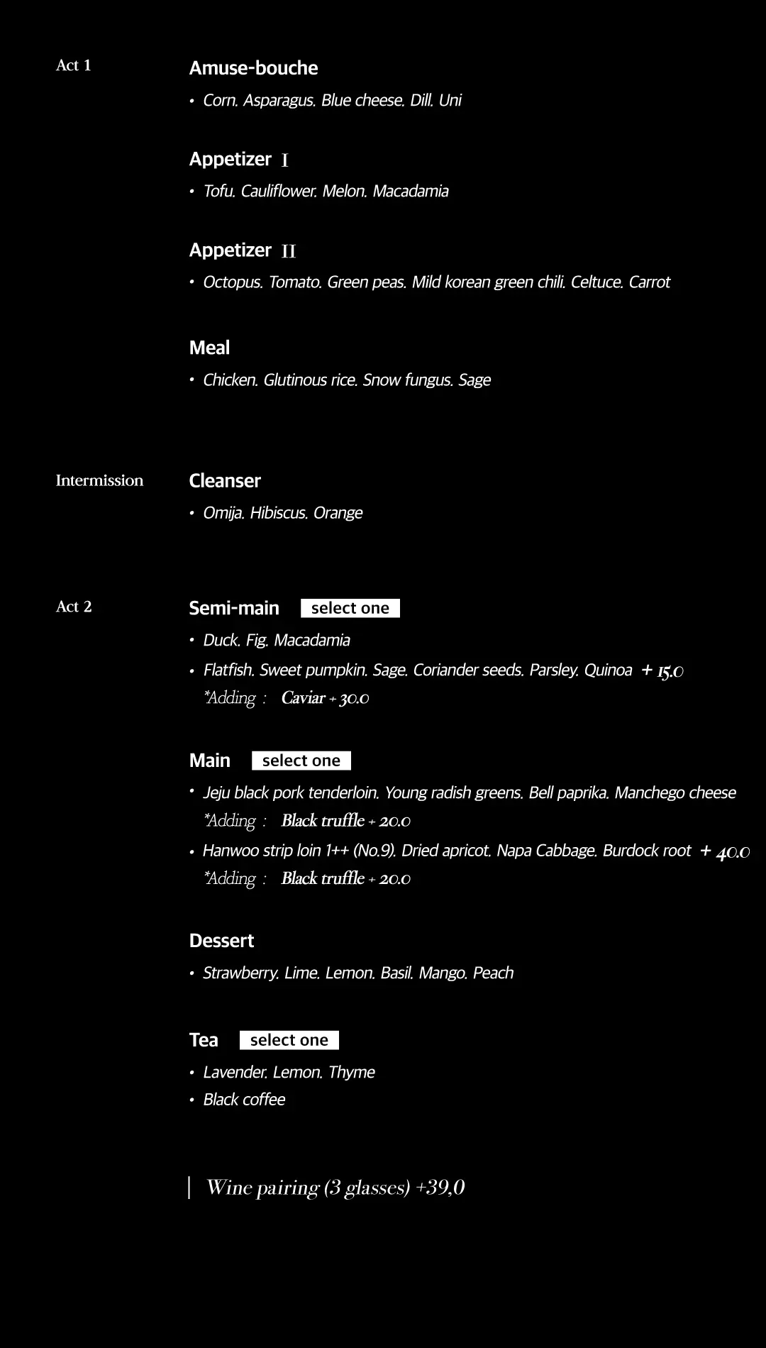 เนื่องจากเราไปเยือนในช่วงฤดูหนาว เราจึงได้ลองคอร์สฤดูหนาว อย่าลืมว่าเมนูของที่นี่จะเปลี่ยนไปตามฤดูกาล ดังนั้นคุณอาจจะได้เมนูที่แตกต่างกัน! ก่อนอื่น เราได้ชิมอามูสบูชขนาดพอดีคำสามอย่างที่น่าประทับใจ อย่างแรกประกอบด้วยแอปเปิ้ล ชีสแพะ ชีสสตราชาเตลลา พิสตาชิโอ ผักชีลาว และหอมแดง มีเนื้อสัมผัสคล้ายเยลลี่ อย่างที่สองเป็นเนื้อสันนอกเกาหลีพรีเมียม เห็ดชิตาเกะ ผักพื้นบ้านเกาหลี และหัวไชเท้า อย่างที่สามทำจากแป้งข้าวโพด น้ำซุปไก่ ชีสพาร์มิไจอาโน-เรจจาโน เนยหมัก และทรัฟเฟิล มีเนื้อสัมผัสกรอบและรสชาติหรูหรา