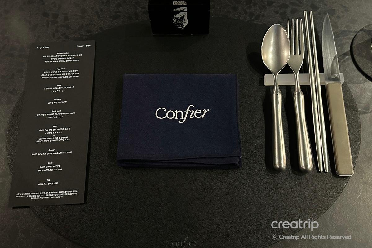 การจัดโต๊ะของพวกเขามีเครื่องใช้บนโต๊ะอาหารสีดำและน้ำเงิน พร้อมเมนูที่มีรายละเอียดเกี่ยวกับคอร์สของวันนี้ คุณยังสามารถใช้คิวอาร์โค้ดเพื่อดูเมนูของ Confier เป็นภาษาอังกฤษและภาษาญี่ปุ่น ตัวเลือกของเราสำหรับวันนี้คือคอร์สอาหารเย็นฤดูหนาวแบบเกาหลี ซึ่งเน้นวัตถุดิบตามฤดูกาล โดยรวมแล้ว สีดำและน้ำเงินซิกเนเจอร์ของ Confier สร้างบรรยากาศที่มีสไตล์